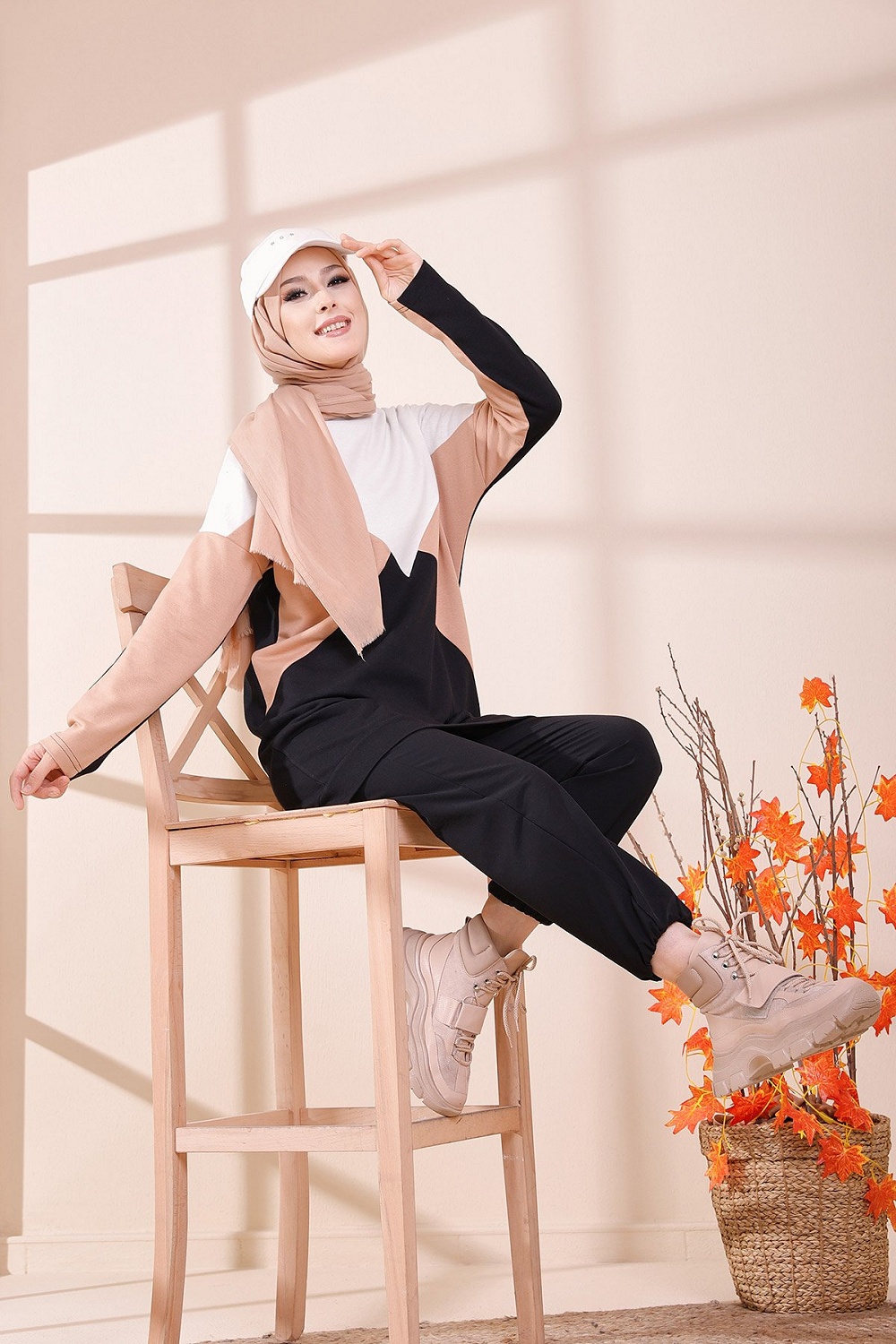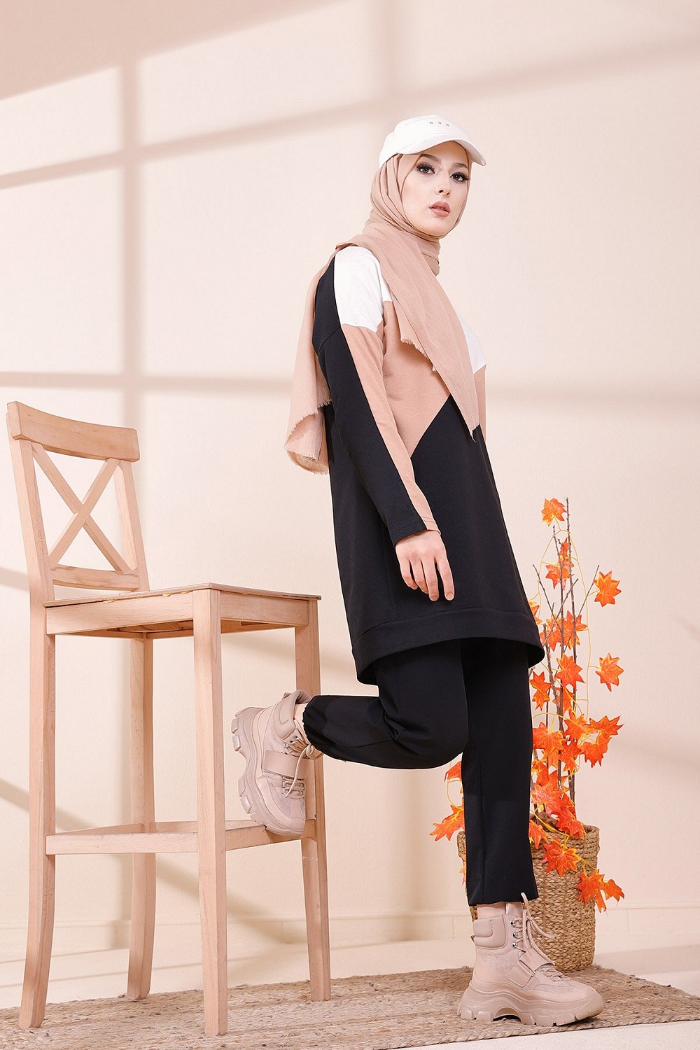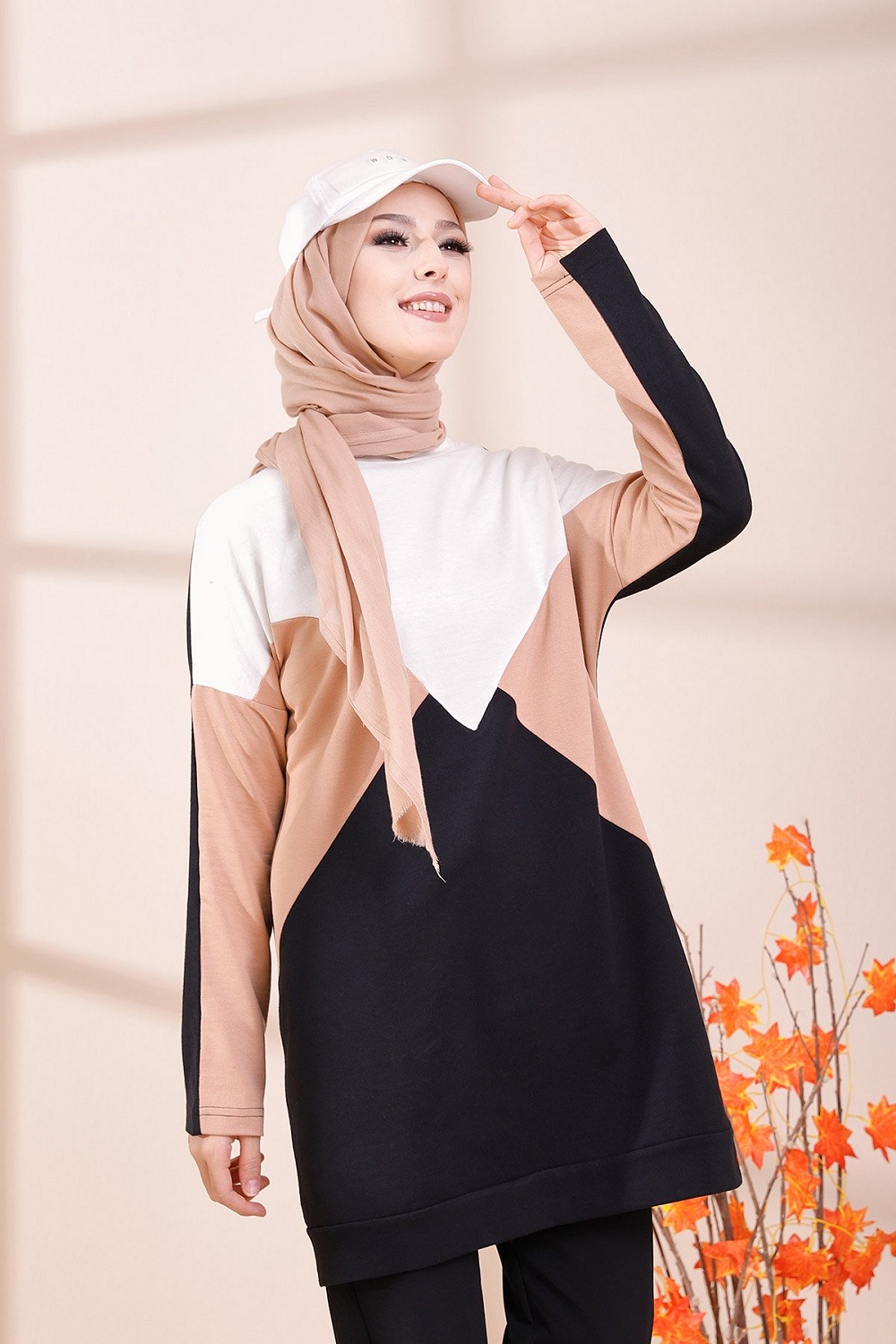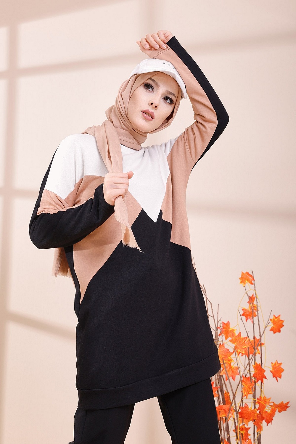 Tunique à capuche tricolore (Vêtement décontracté moderne pour femme voilée) - Couleur noir, blanc et kaki - REF. 38281 (24.00 €)