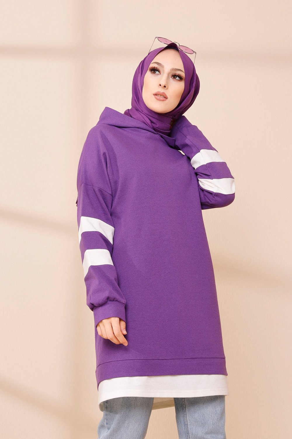 Tunique decontractee avec capuche (Vetement hijab) - Couleur violet avec bandes blanches