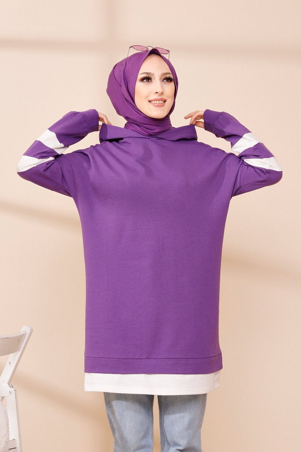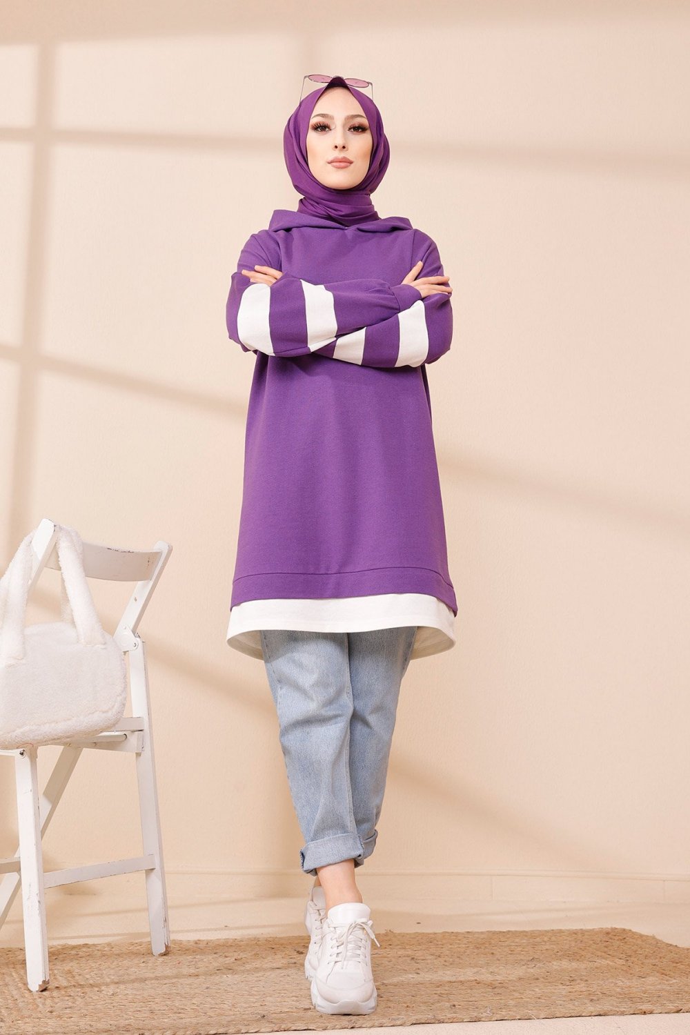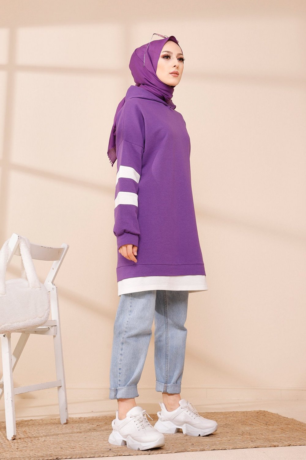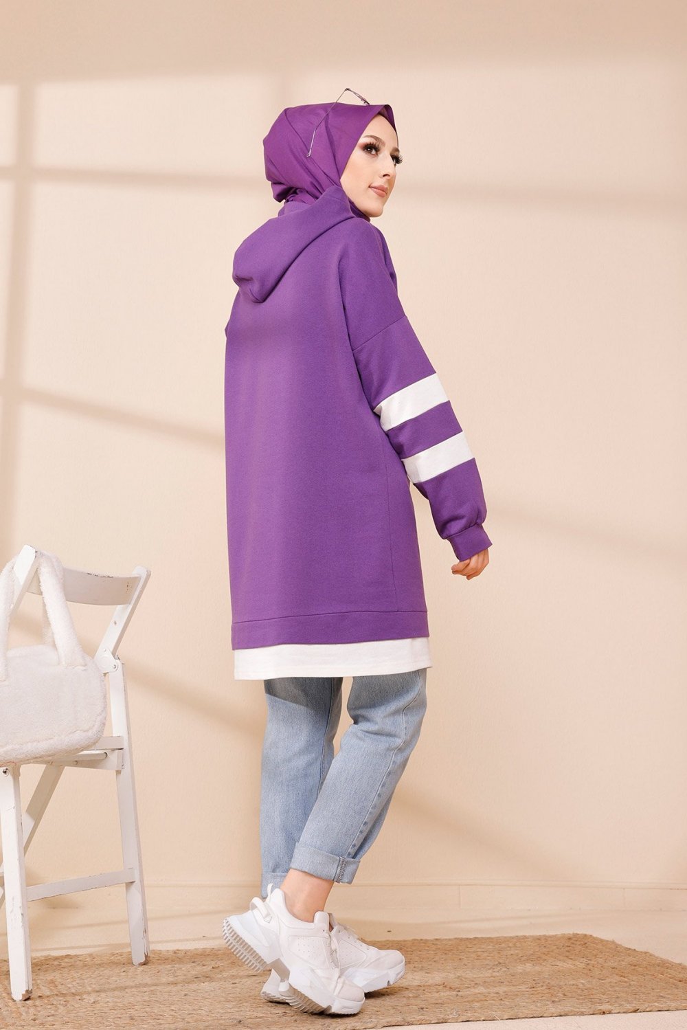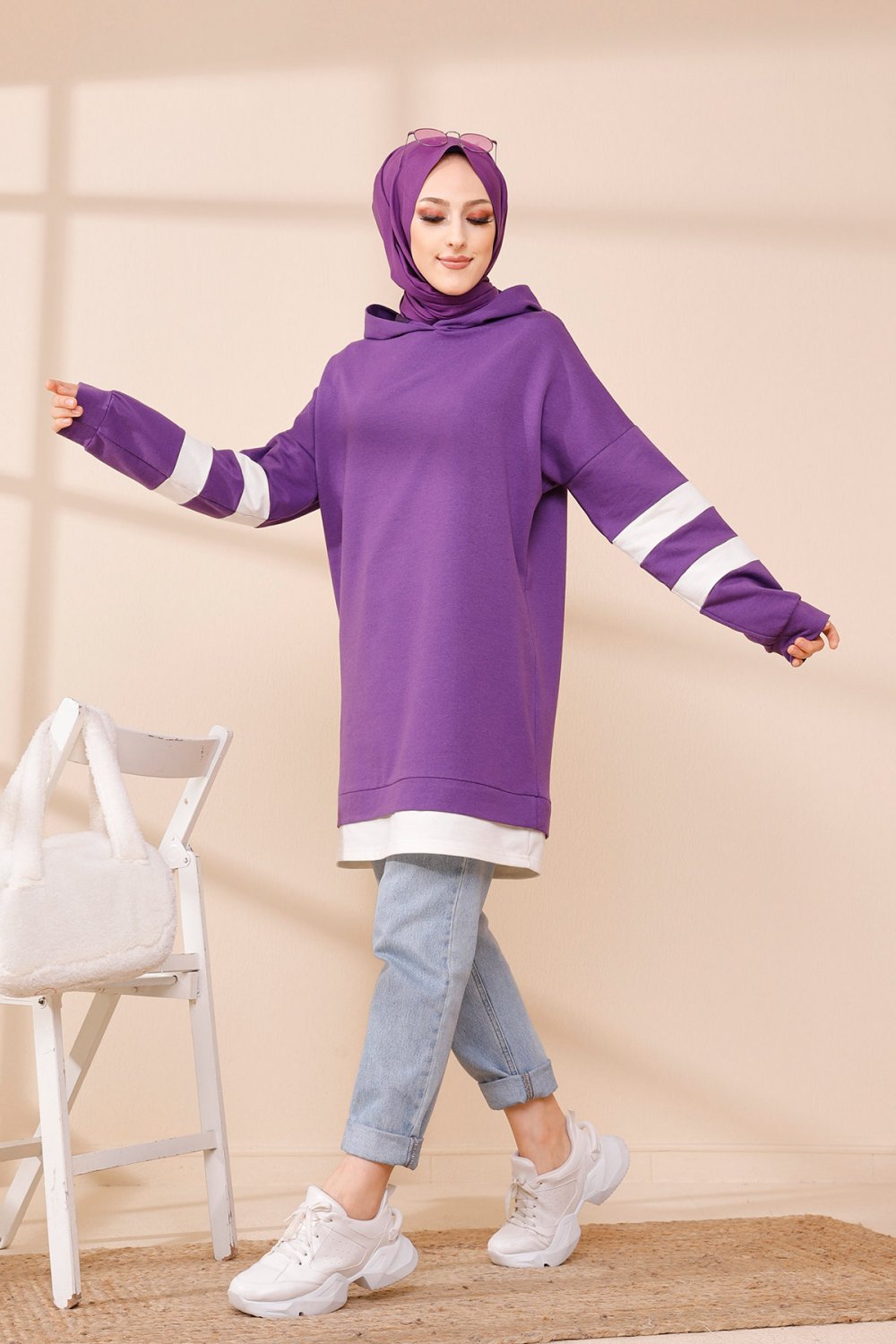Tunique décontractée avec capuche (Vêtement hijab) - Couleur violet avec bandes blanches Vetement & Accessoire
