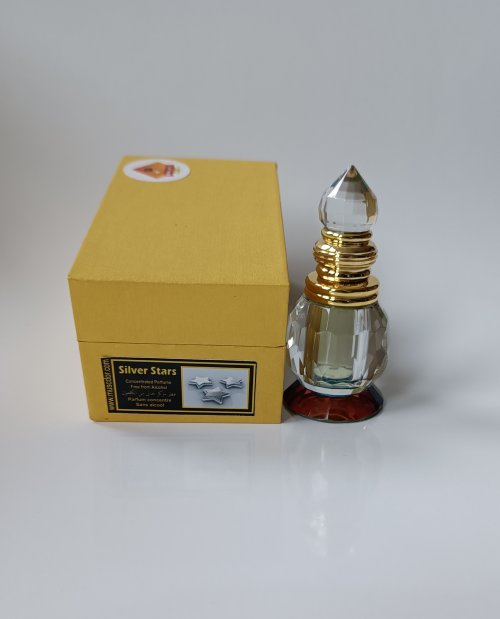 Parfum concentré sans alcool Musc d'Or "Silver Stars" pour hommes dans jolie bouteilles en cristal et métal doré. Avec sa boite cadeau jaune.