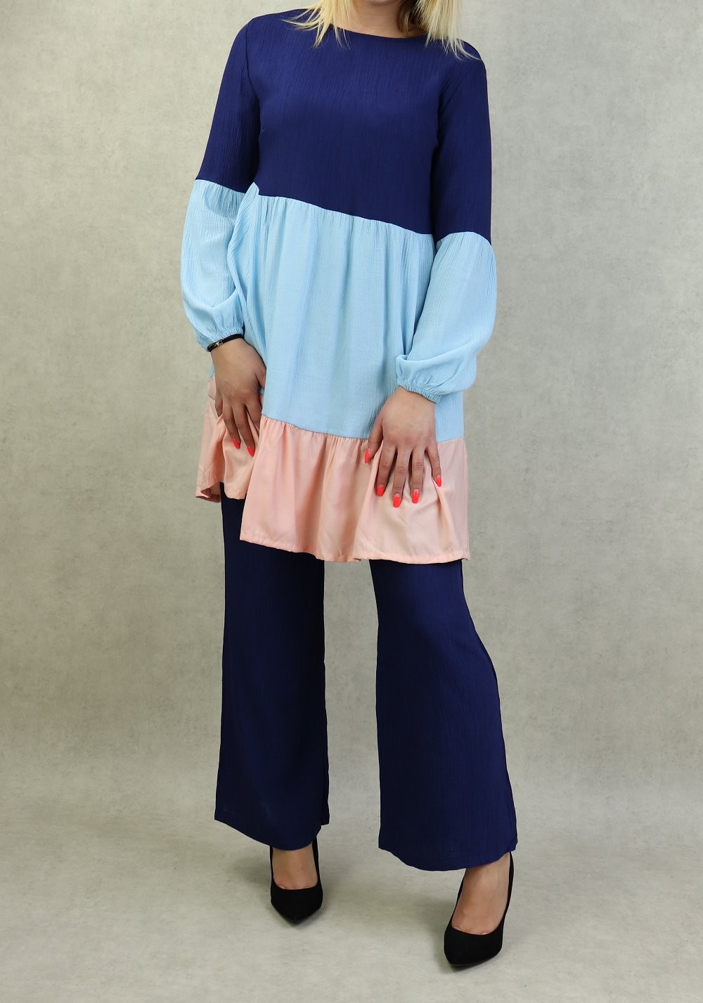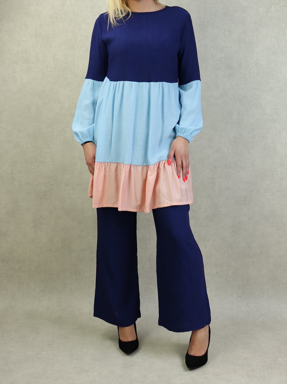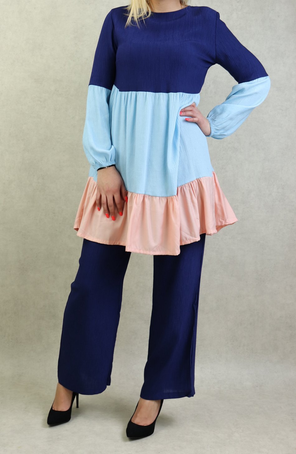Ensemble 2 pièces : Tunique longue, col rond fermeture bouton, manches légèrement bouffantes, volants, coupe évasée ; et son pantalon assorti ample, coupe droite, taille élastique. Mélange de matières. Cet ensemble sobre et élégant n'a besoin de rien d'autre pour être mis en valeur.