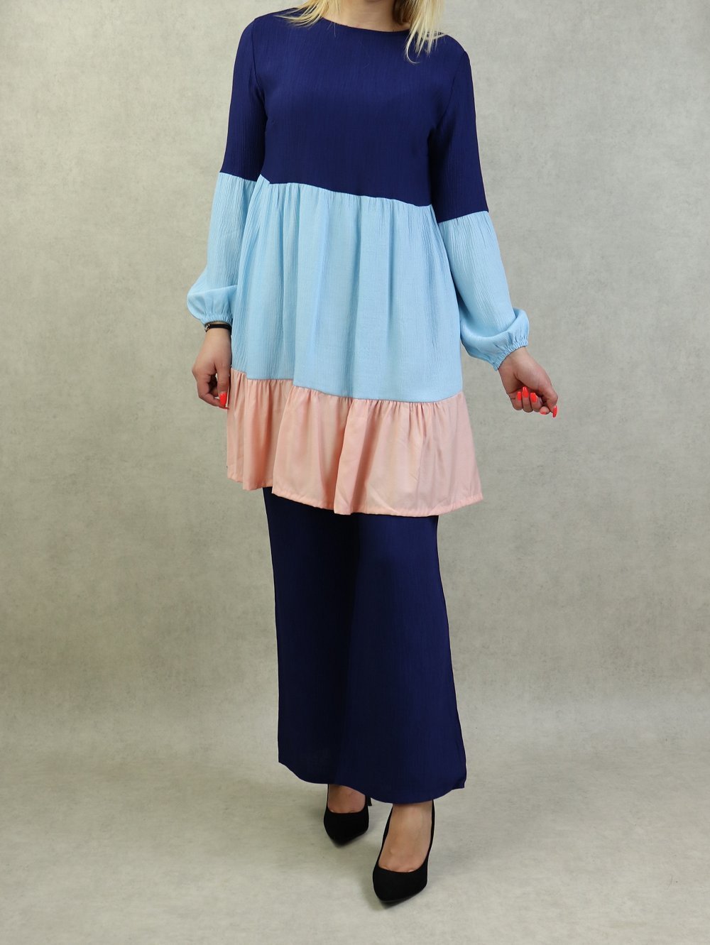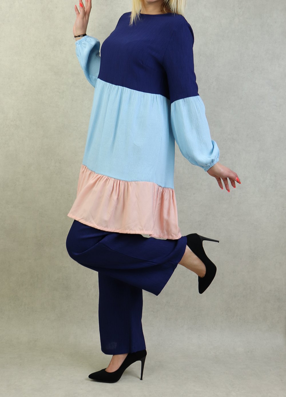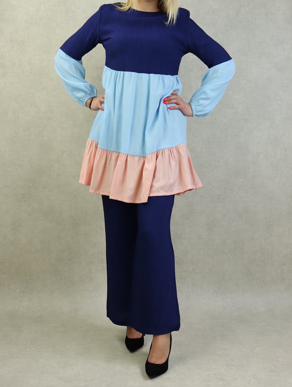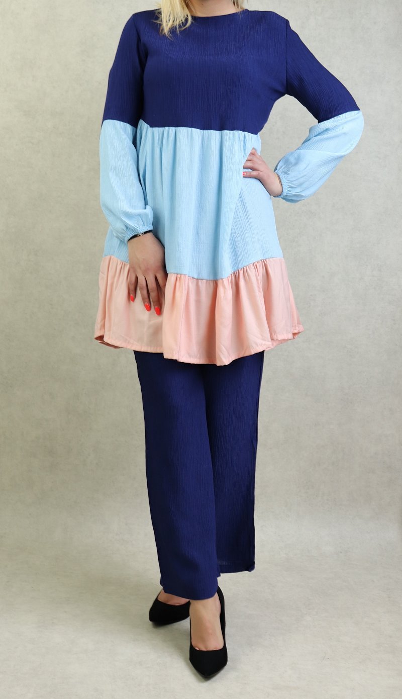 Ensemble 2 pièces : Tunique longue, col rond fermeture bouton, manches légèrement bouffantes, volants, coupe évasée ; et son pantalon assorti ample, coupe droite, taille élastique. Mélange de matières. Cet ensemble sobre et élégant n'a besoin de rien d'autre pour être mis en valeur.