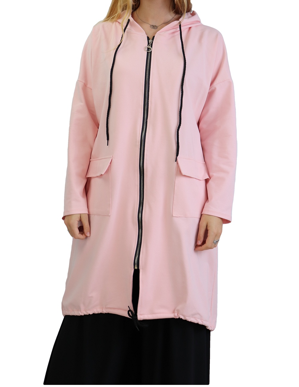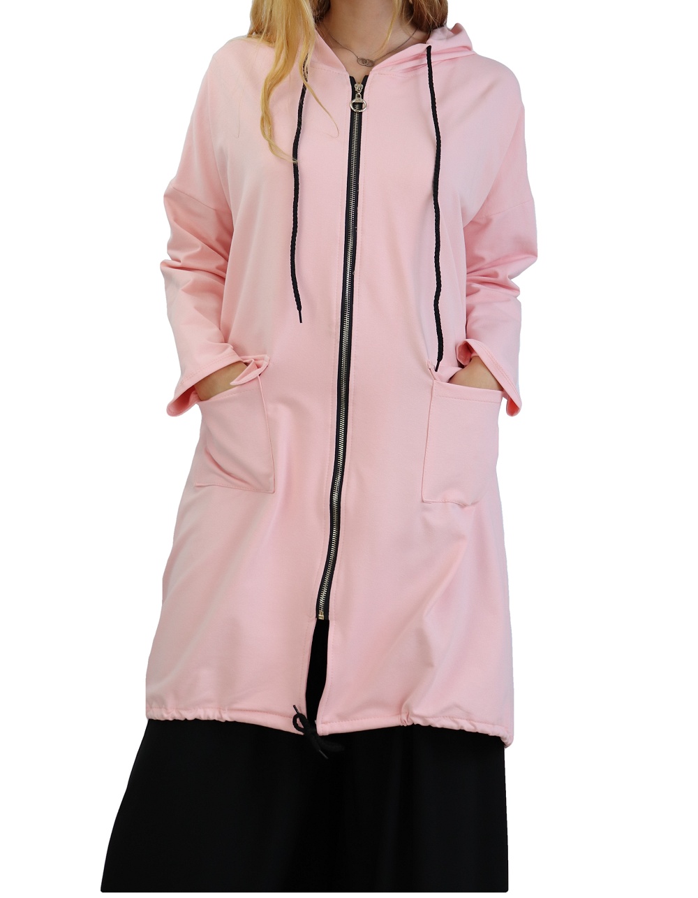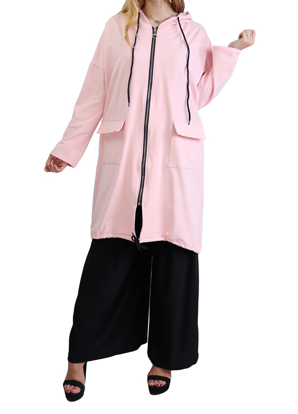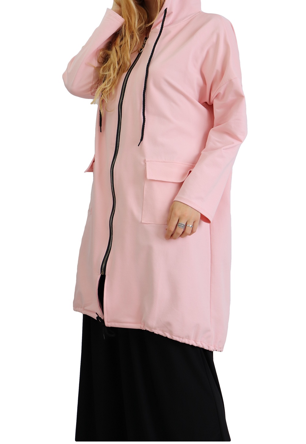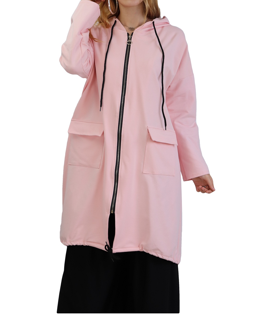 Veste zippée, manches longues, capuche avec lien de serrage ainsi qu'en bas du vêtement, poches plaquées à rabats. Coupe droite, matière sweat agréable à porter.