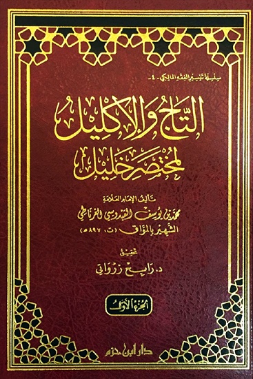 التاج والاكليل لمختصر خليل وضعه محمد بن يوسف بن أبي القاسم بن يوسف العبدري الغرناطي، أبو عبد الله المواق المالكي ( ت 897هـ ). وهو كتاب ثمين قيّم يتبحّر في الفروع على المذهب المالكي شرح فيه مؤلفه مختصر الإمام خليل واعتنى به ورتبه على الكتب والأبواب الفقهية، ينقل عن أئمة المذهب المالكي ويعزو الأقوال إلى أصحابها ويذكر أحيانا آراء المذاهب الأخرى ويختار الراجح من الأقوال في المذاهب.