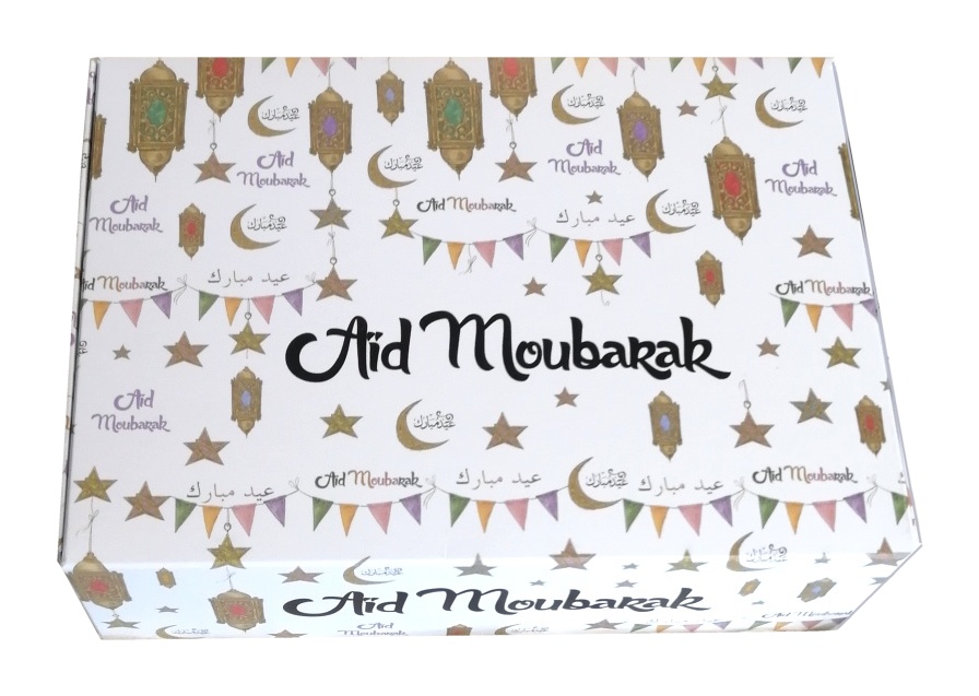Coffret cadeau "Aïd Moubarak". Idéal pour faire des pack cadeaux avec des livres (Coran, citadelle, musc ou autres objets...), ou servir en guise de boite à gâteaux ou contenir d'autres objets...