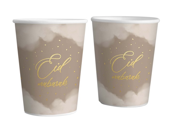 Complétez votre table de l'Aïd parfaitement décorée avec ces gobelets en papier dont l'écriture «Eid Mubarak» est faite sur feuille d'or ainsi que les bordures.