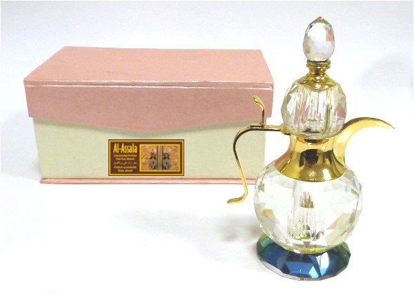 Grande bouteille de parfum en cristal et métal doré sous forme de théière, avec sa boite cadeau.