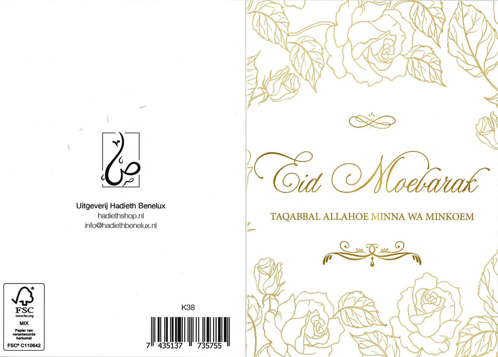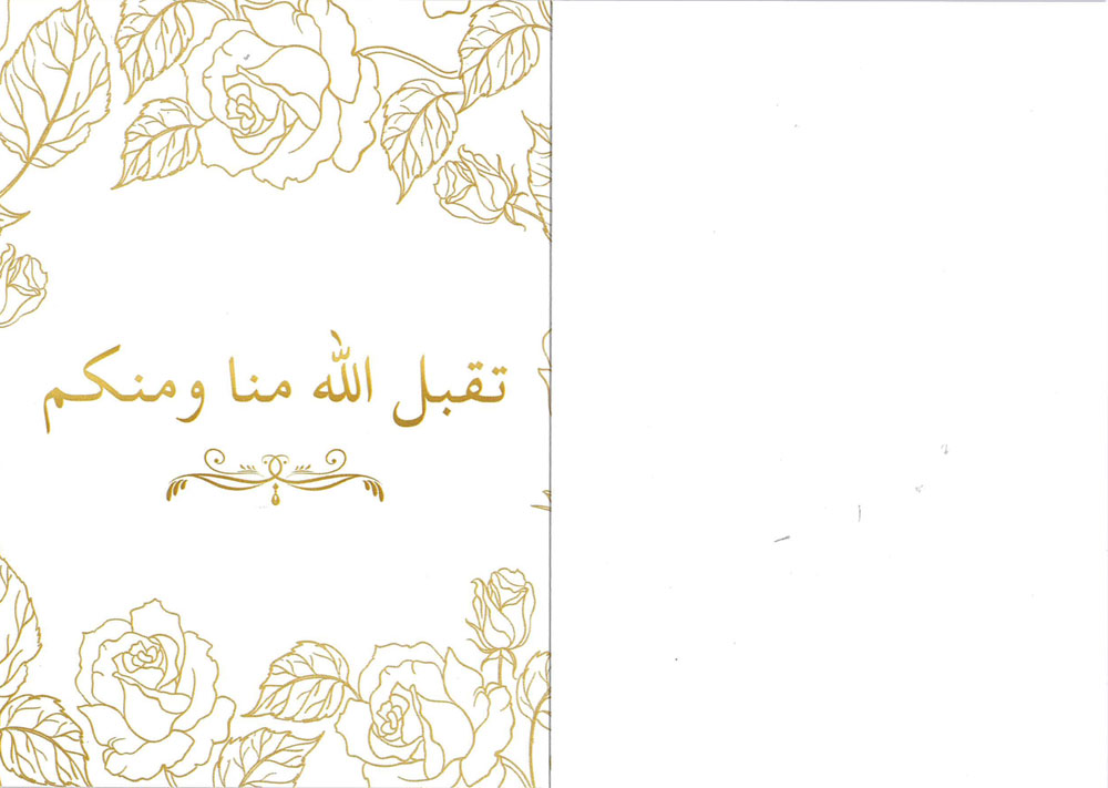 Carte de voeux avec la formule "Eid Moebarak - Taqabbal Allahoe Minna Wa Minkom" sur le coté extérieur.