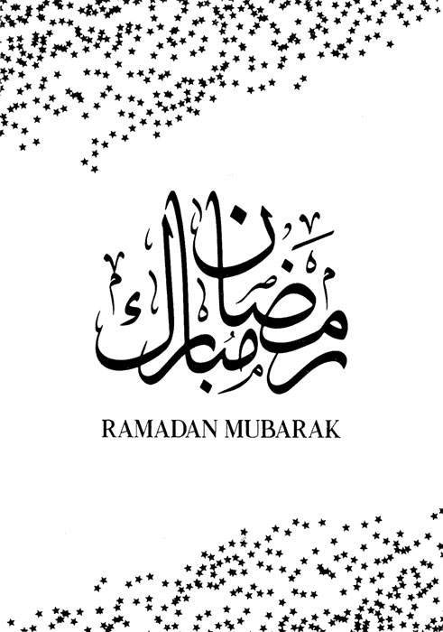 Carte de voeux avec la mention "Ramadan Mubarak" et une calligraphie arabe avec la formule : رمضان مبارك
