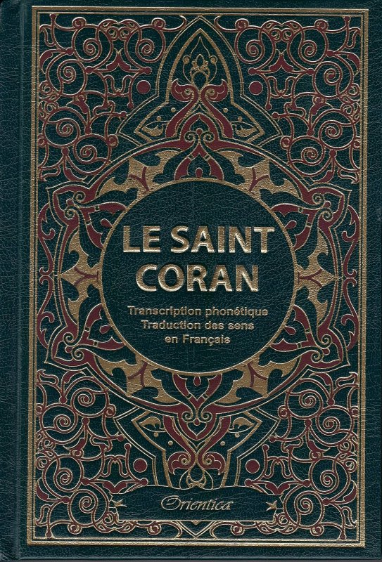 Le Saint Coran arabe vert avec traduction en langue francaise du sens de ses versets et transcription phonetique avec arabesques bordeaux bordees de dorure