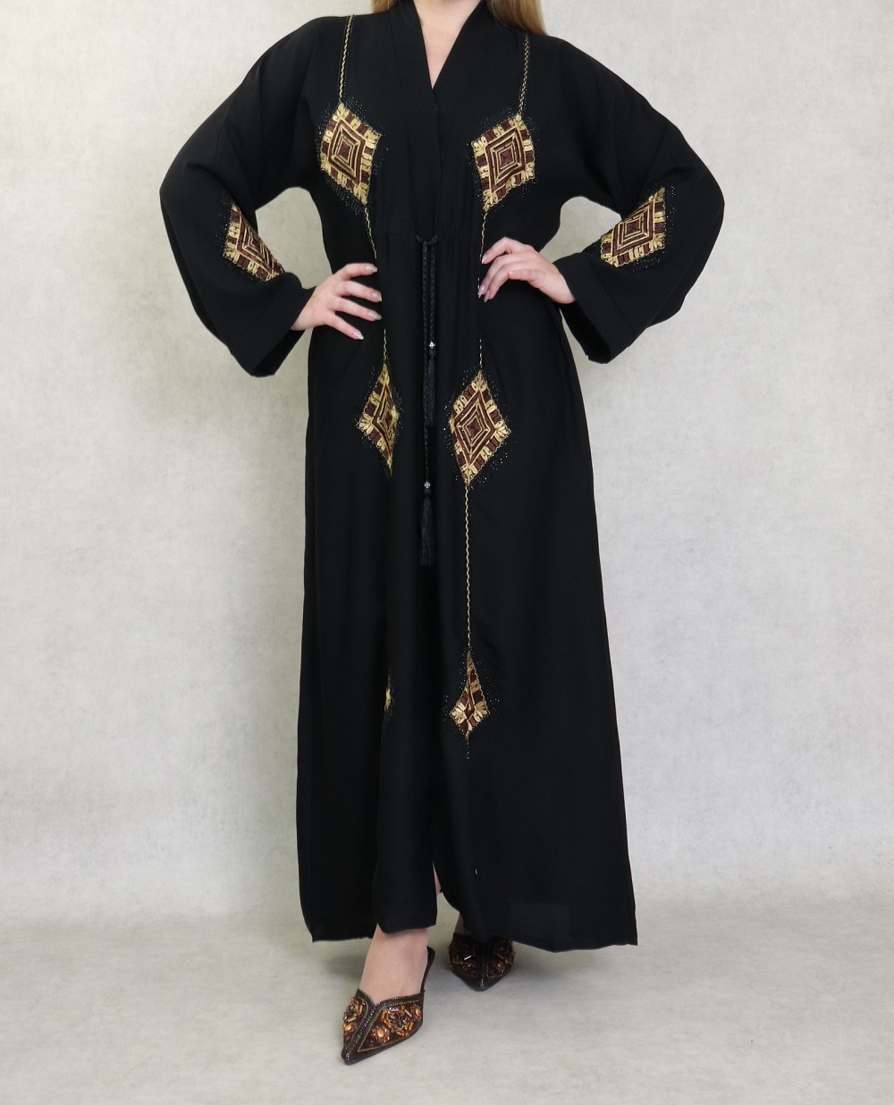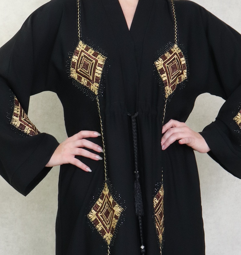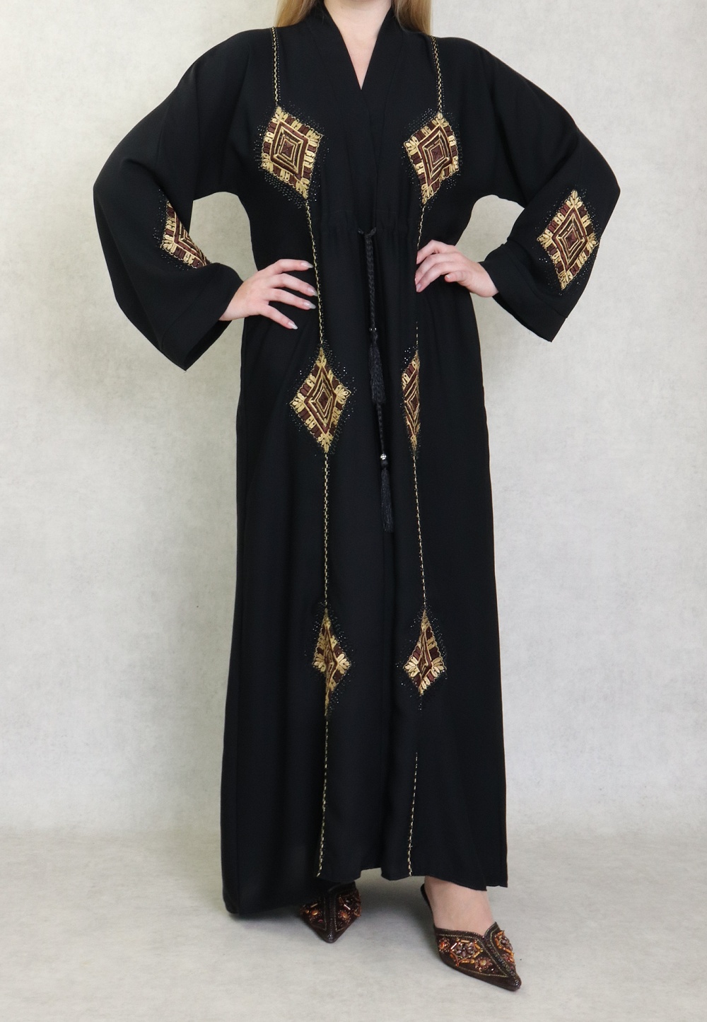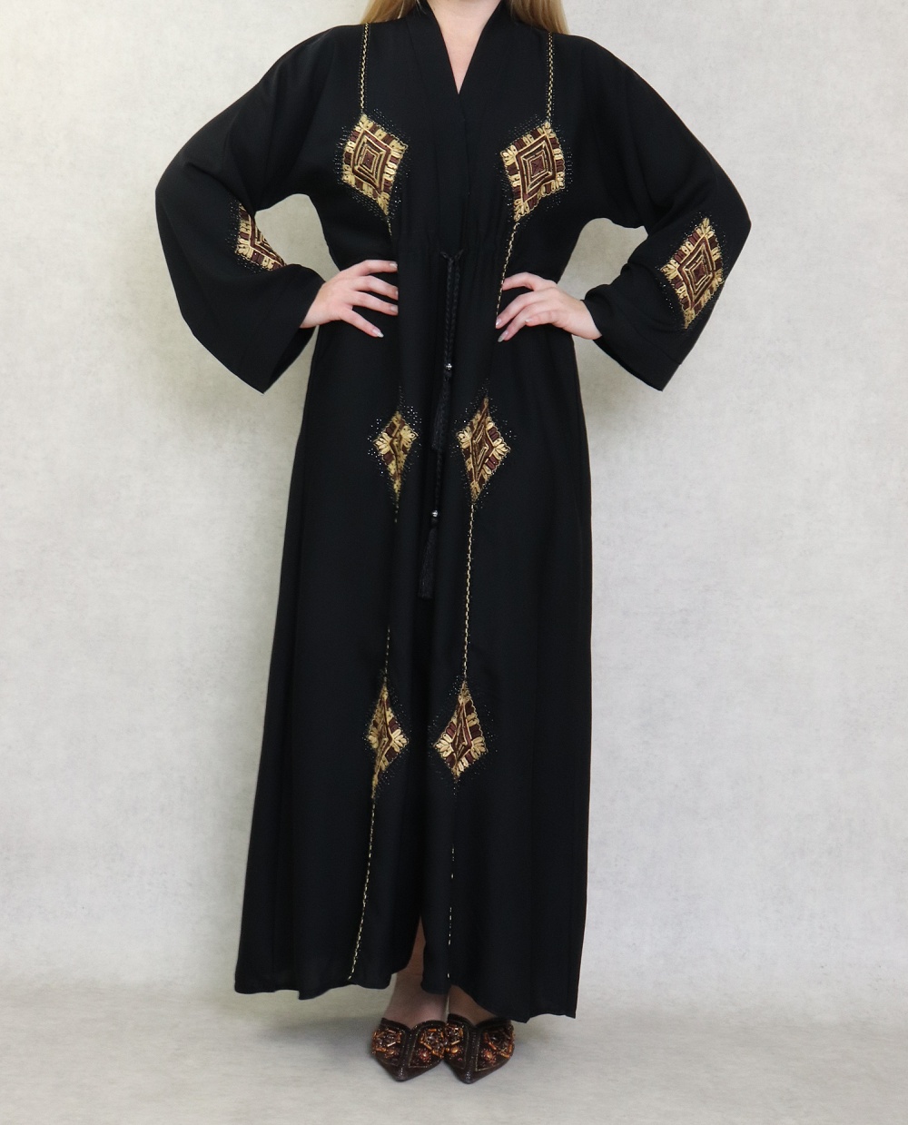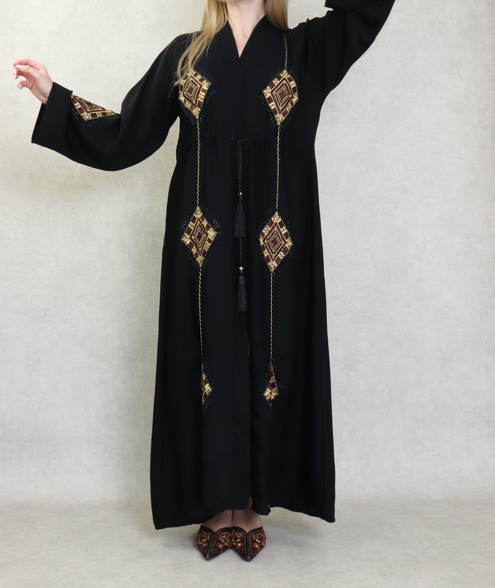 Robe Abaya Dubaï noire de qualité avec broderie et strass dorés et ceinture interne - REF. 38193 (39.90 €)