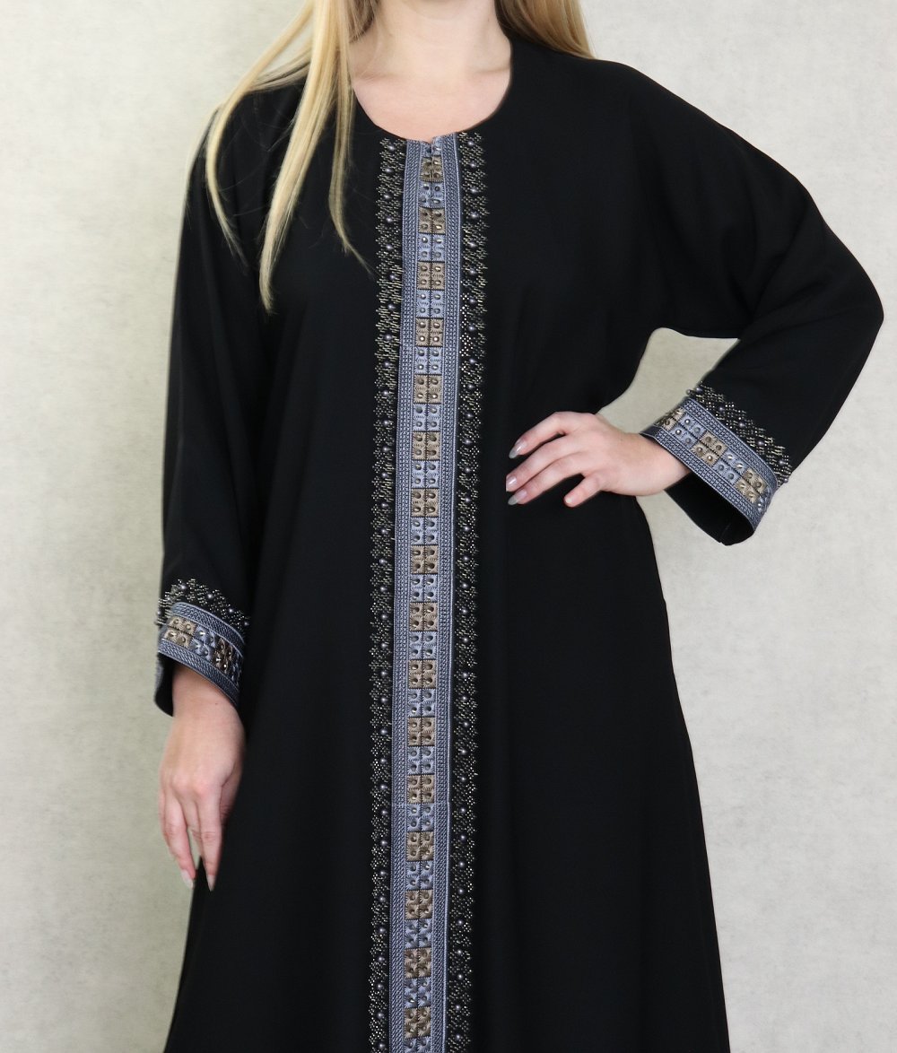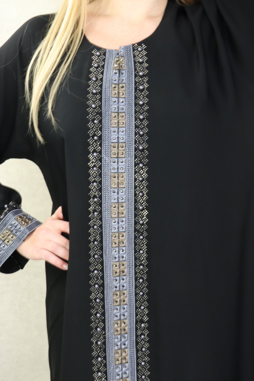 Robe Abaya Dubaï noire de qualité avec bande brodée et strass et perles argentées - REF. 38189 (45.00 €)