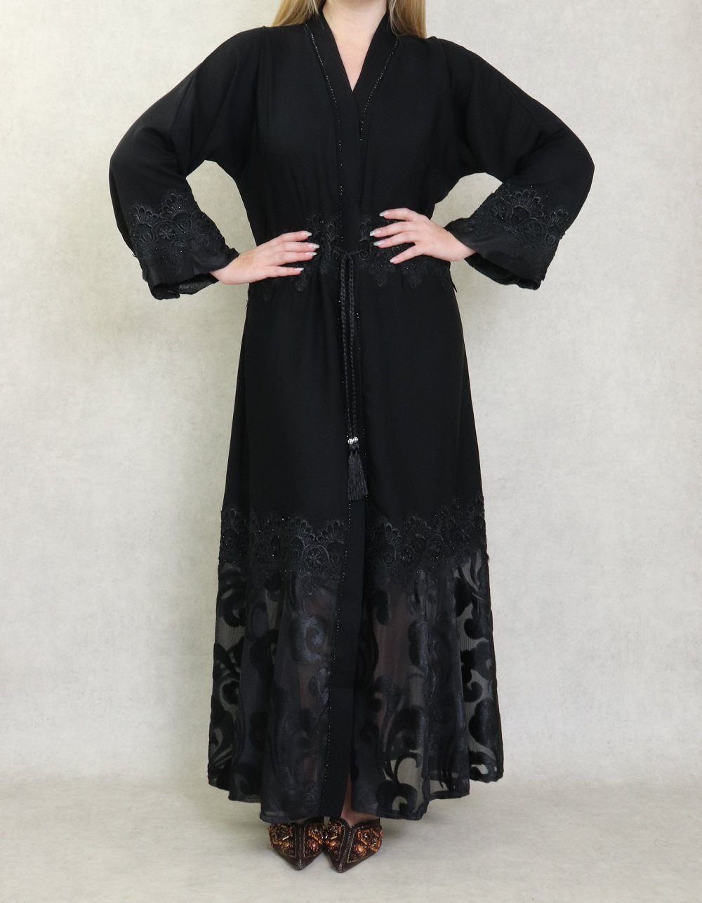 Robe Abaya Kimono Dubaï noire de qualité avec ceinture de serrage interne, strass, perles et broderies - REF. 38139 (49.00 €)