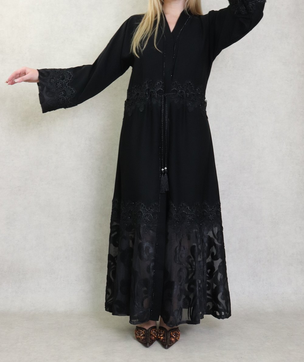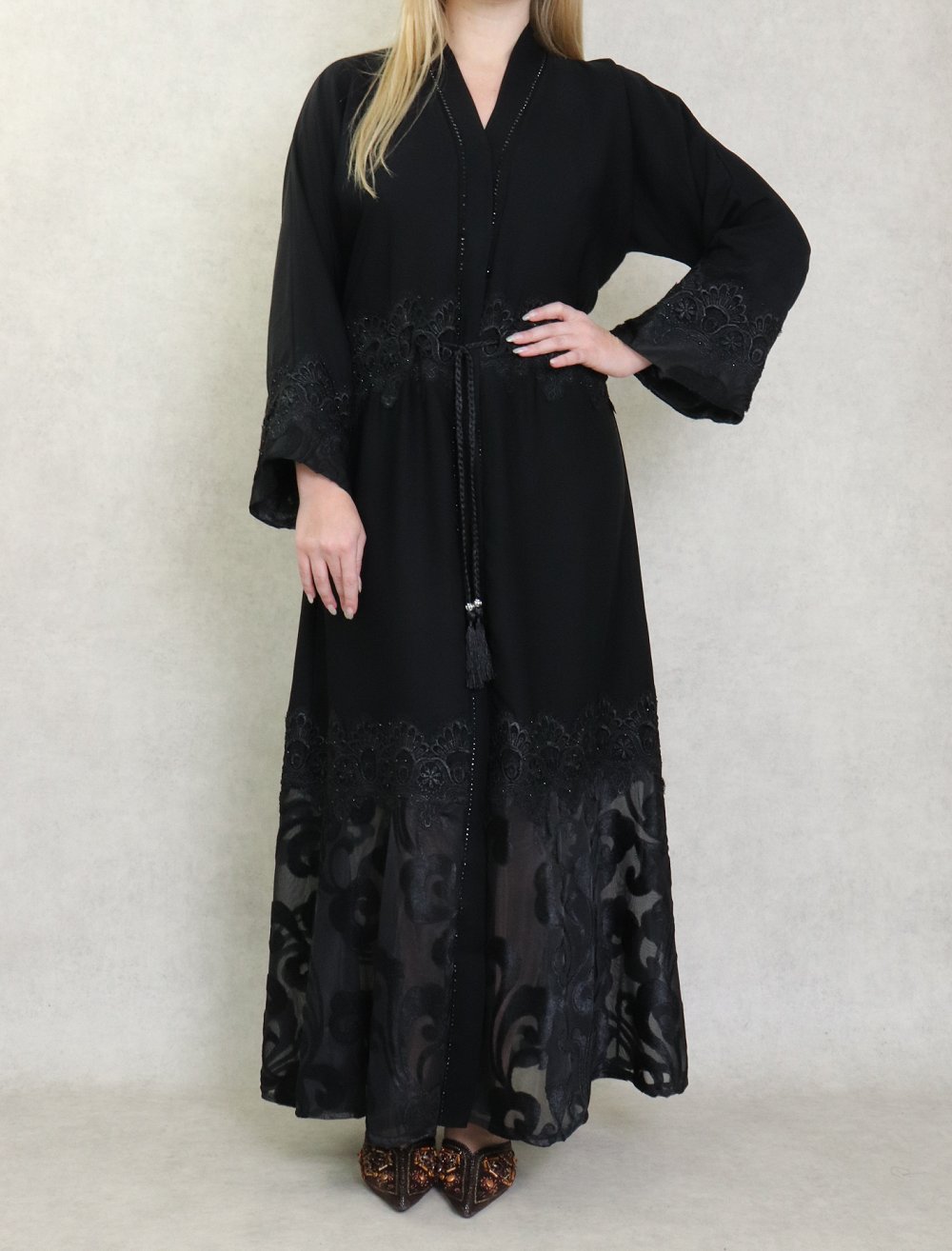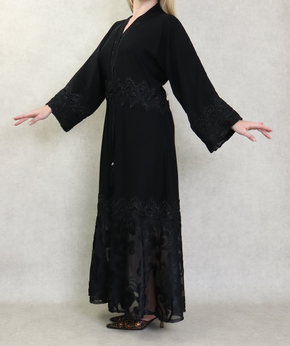 Robe Abaya Dubaï noire de qualité strass et dentelle noires - REF. 38197 (45.00 €)
