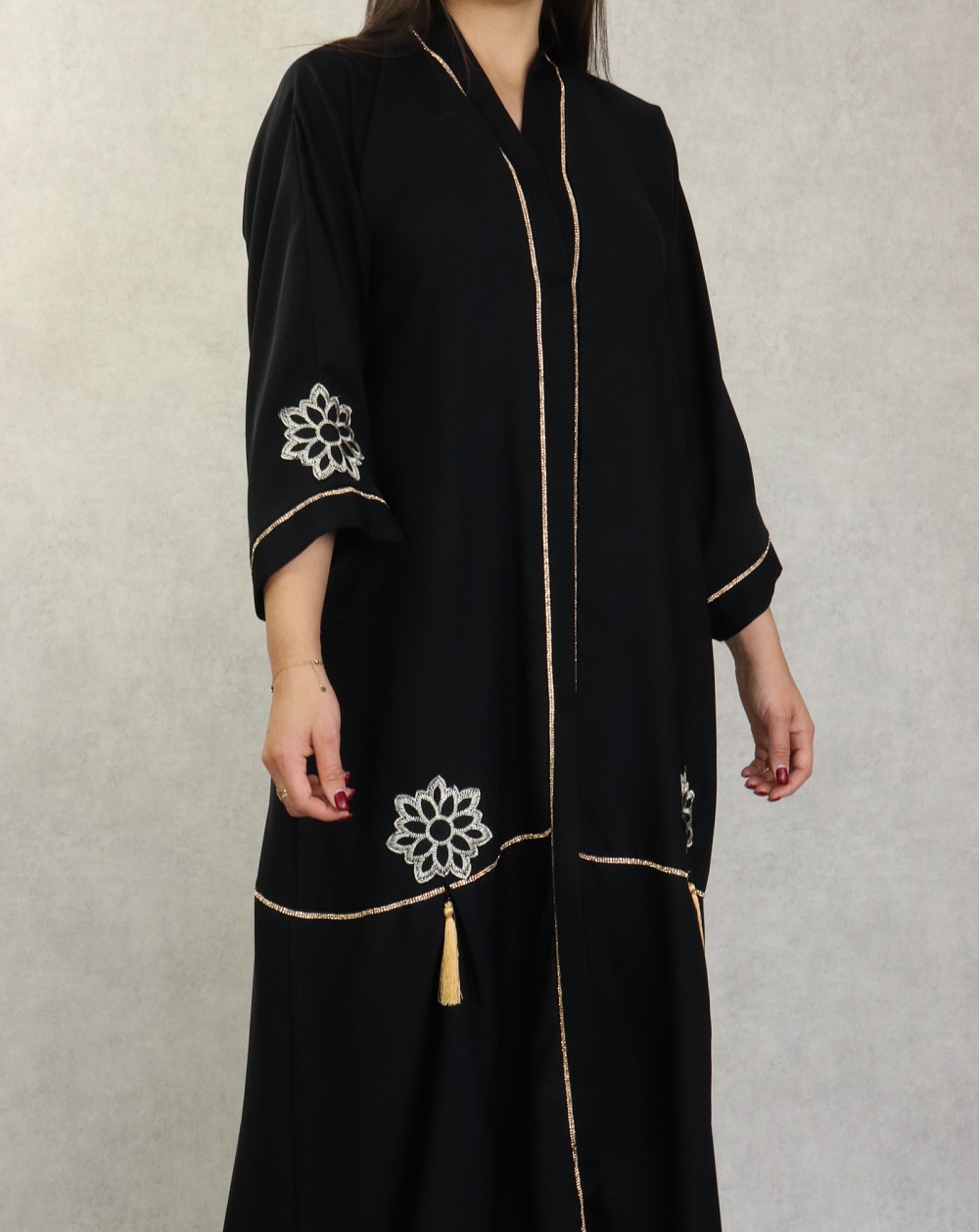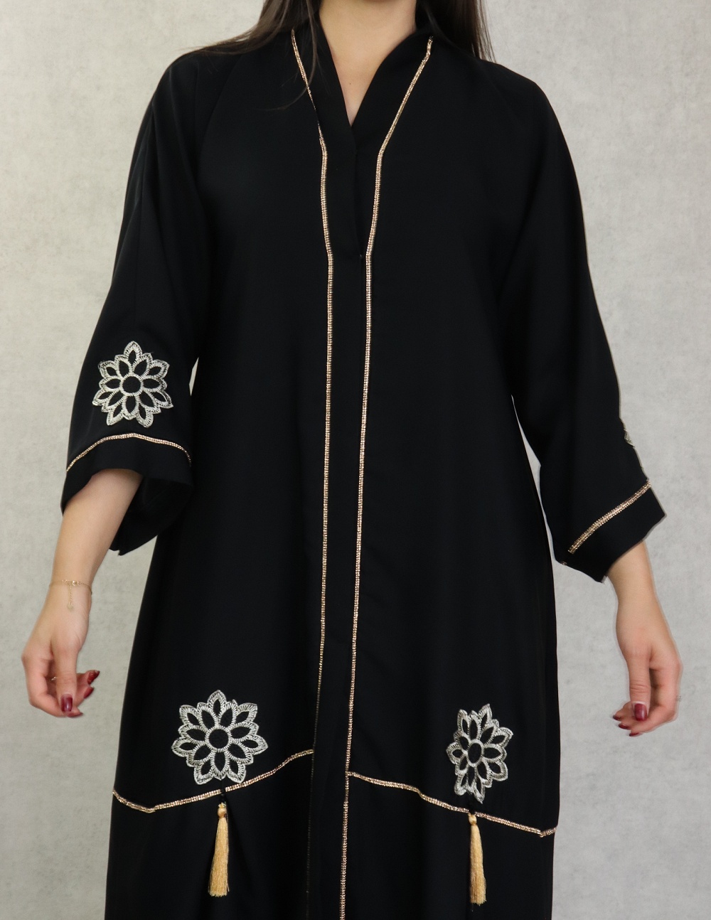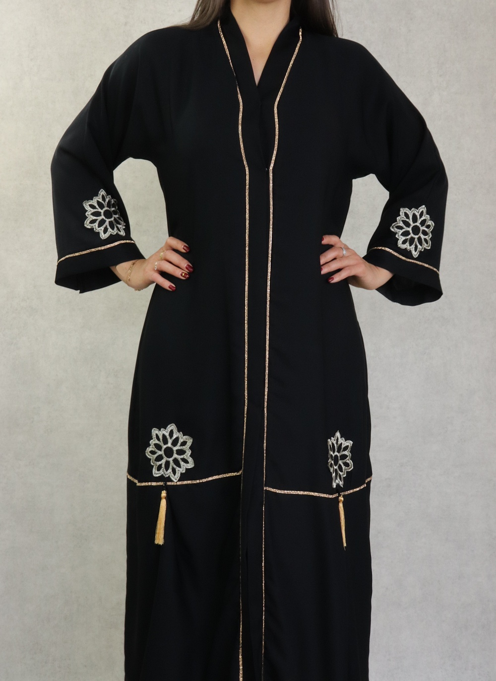 Abaya Dubai de couleur noir fournie avec son châle assorti. La robe s'ouvre à l'avant (fermeture grâce à des boutons pressions).