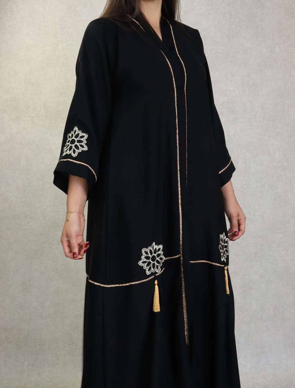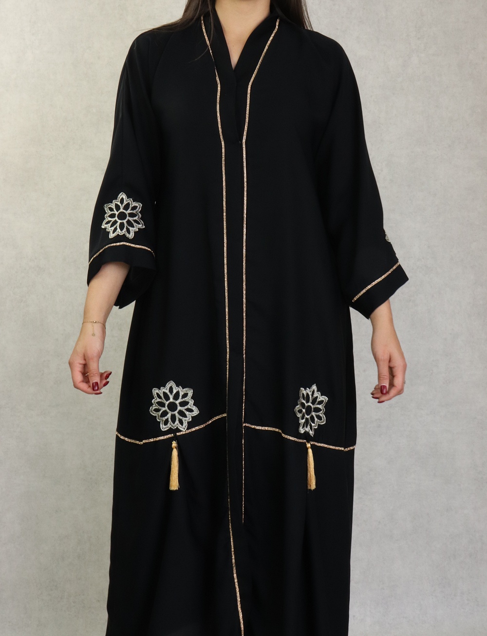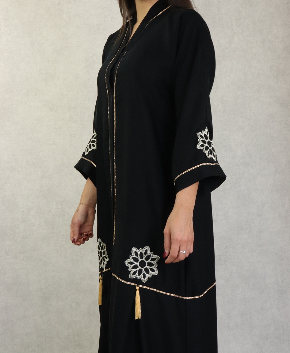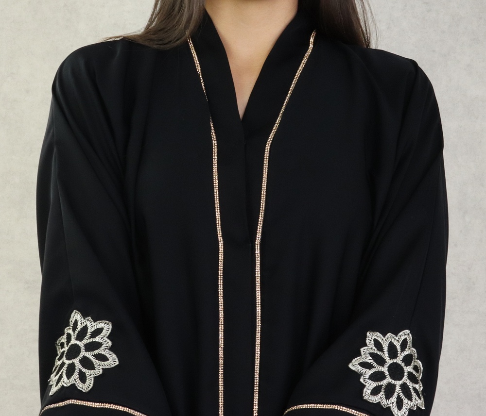 Abaya Dubai de couleur noir fournie avec son châle assorti. La robe s'ouvre à l'avant (fermeture grâce à des boutons pressions).