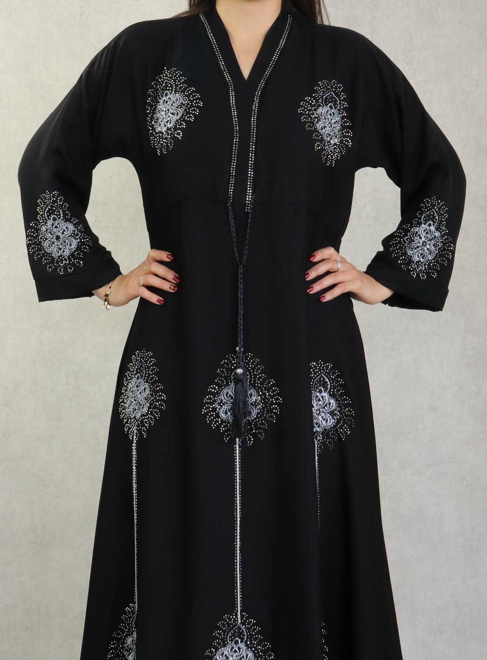 Robe Abaya Dubaï noire de qualité avec broderie et strass argenté et ceinture interne - REF. 38194 (45.00 €)