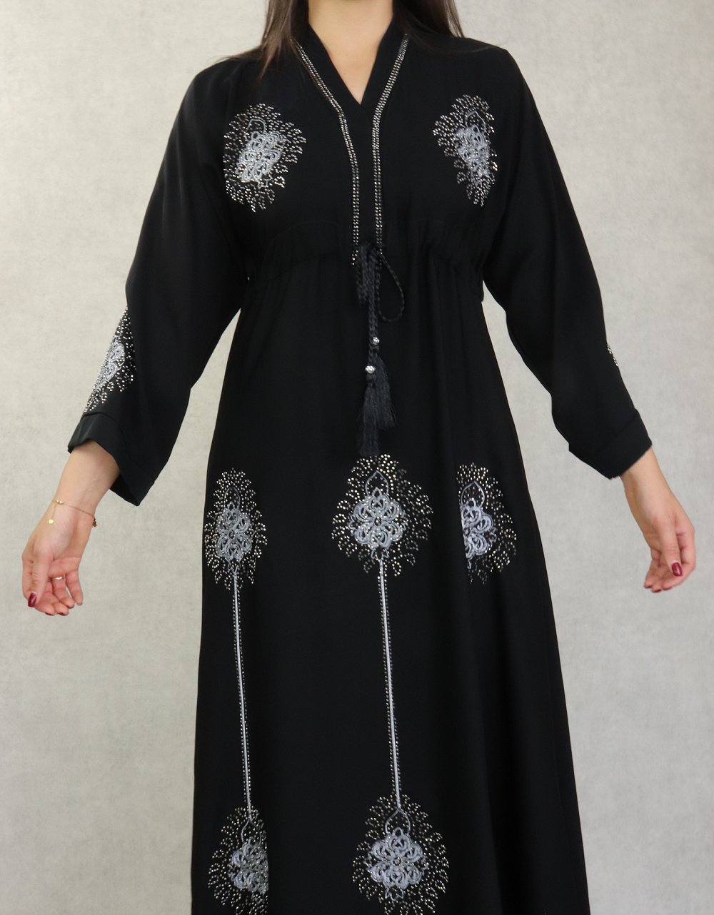 Robe de soirée Abaya Dubaï noire de qualité avec broderie perles et strass argentés - REF. 38190 (49.00 €)