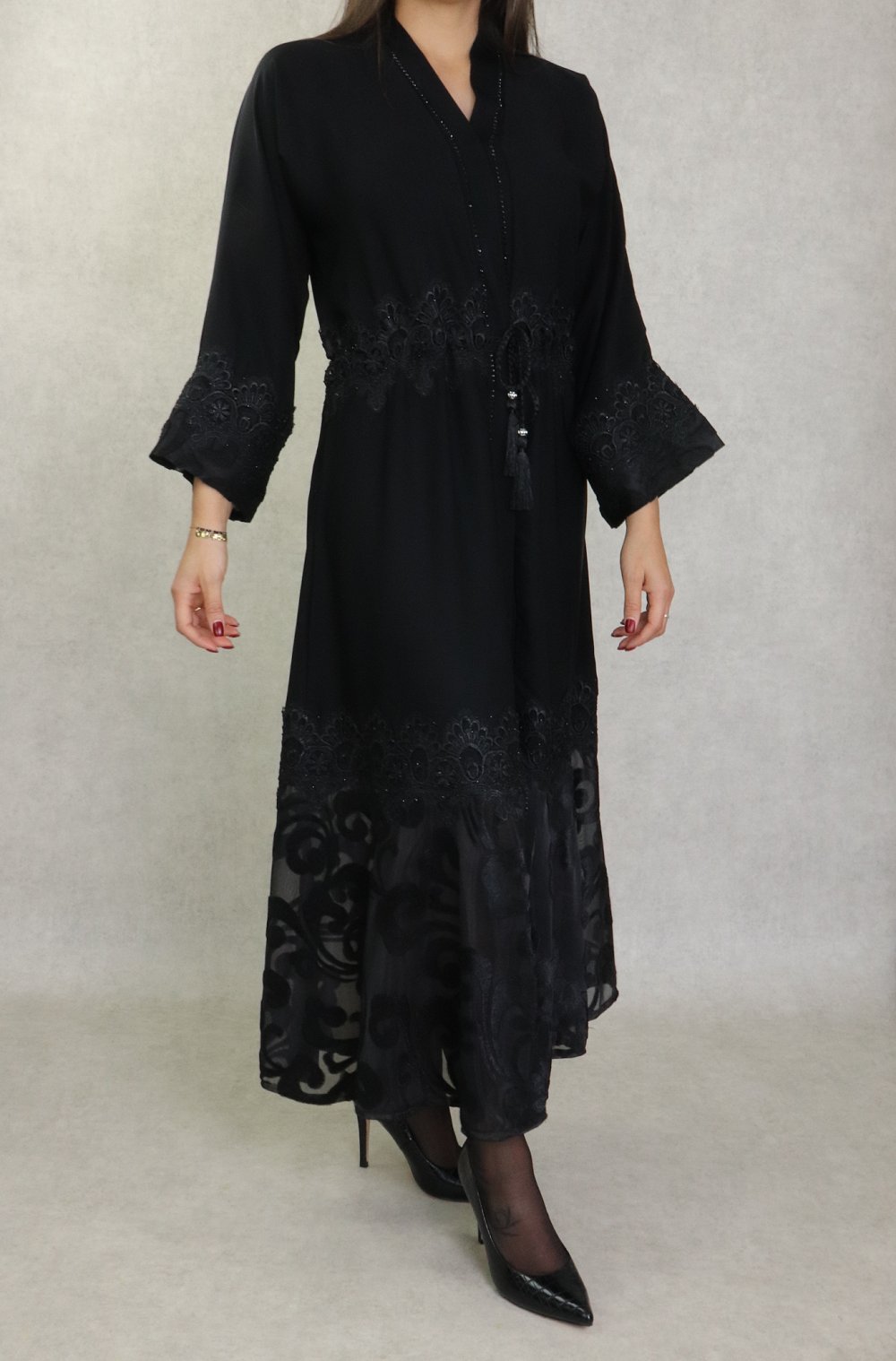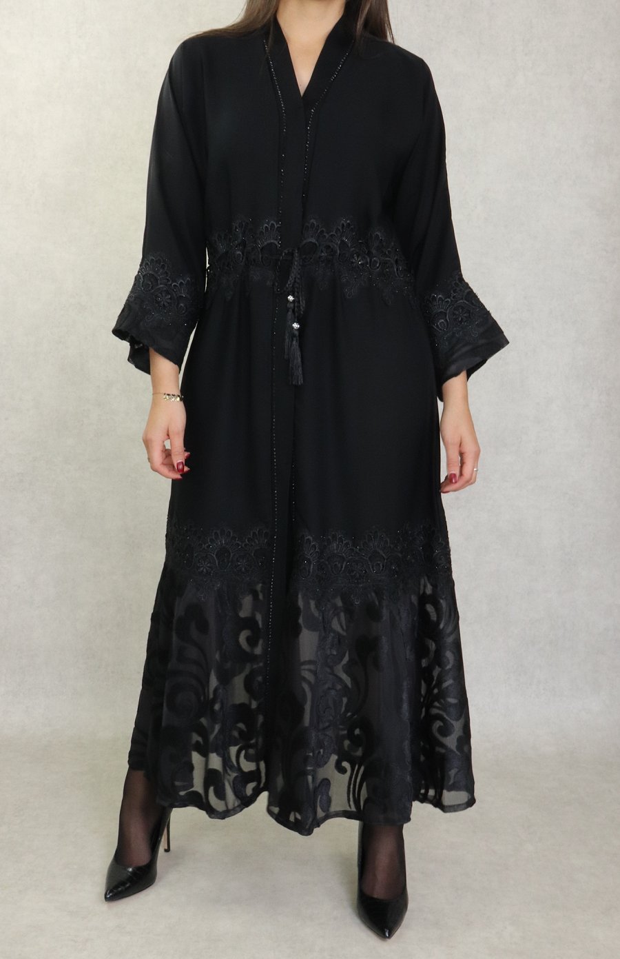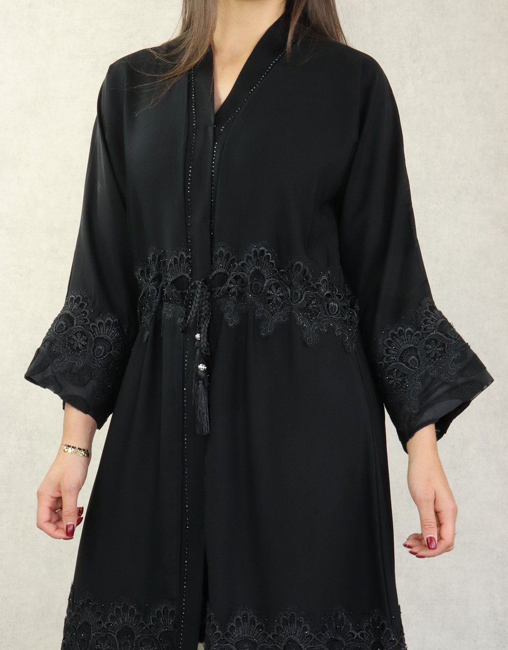 Abaya Dubai de couleur noir fournie avec son châle assorti. La robe comporte une partie avec dentelle. La robe s'ouvre sur tout le long avec fermeture à bouton pression. Elle possède une ceinture interne très pratique.
