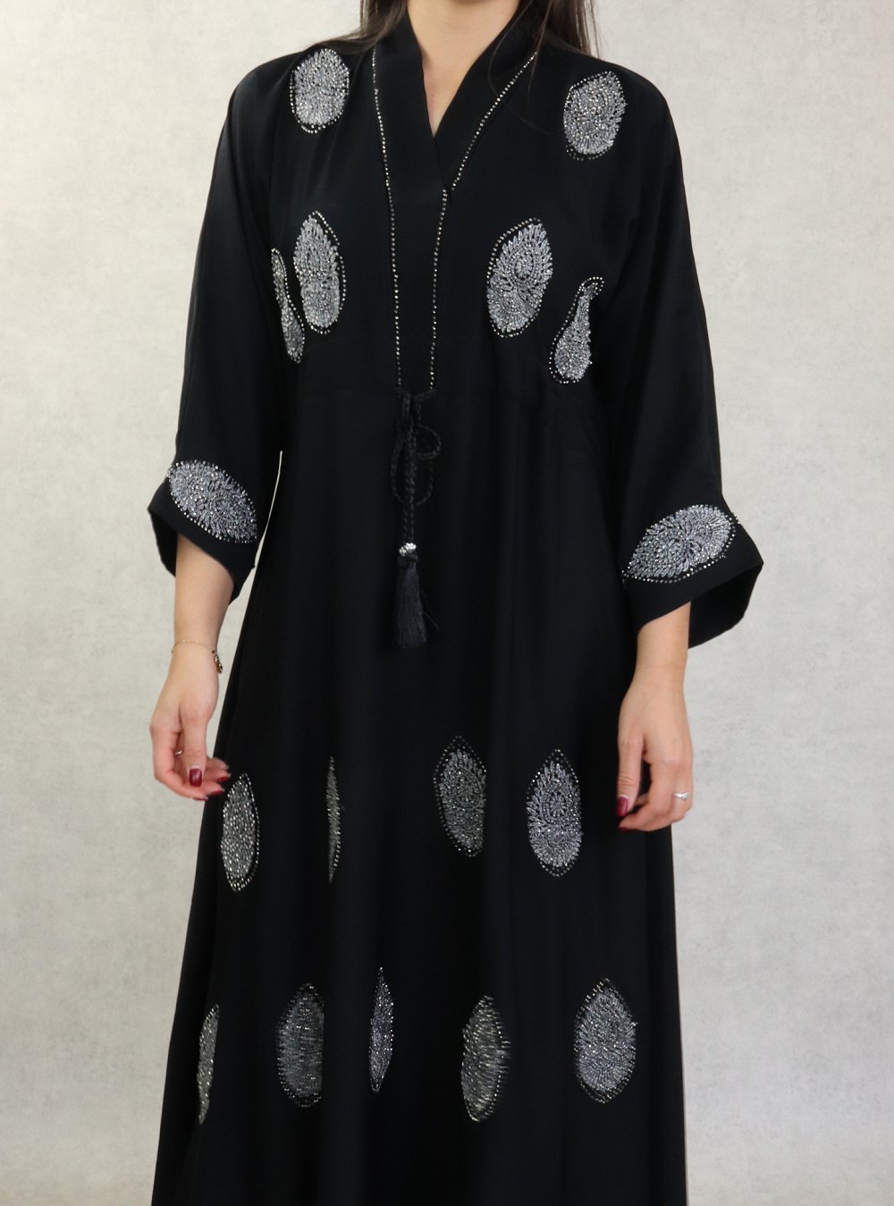 Robe de soirée Abaya Dubaï noire de qualité avec broderie perles et strass argentés - REF. 38190 (49.00 €)