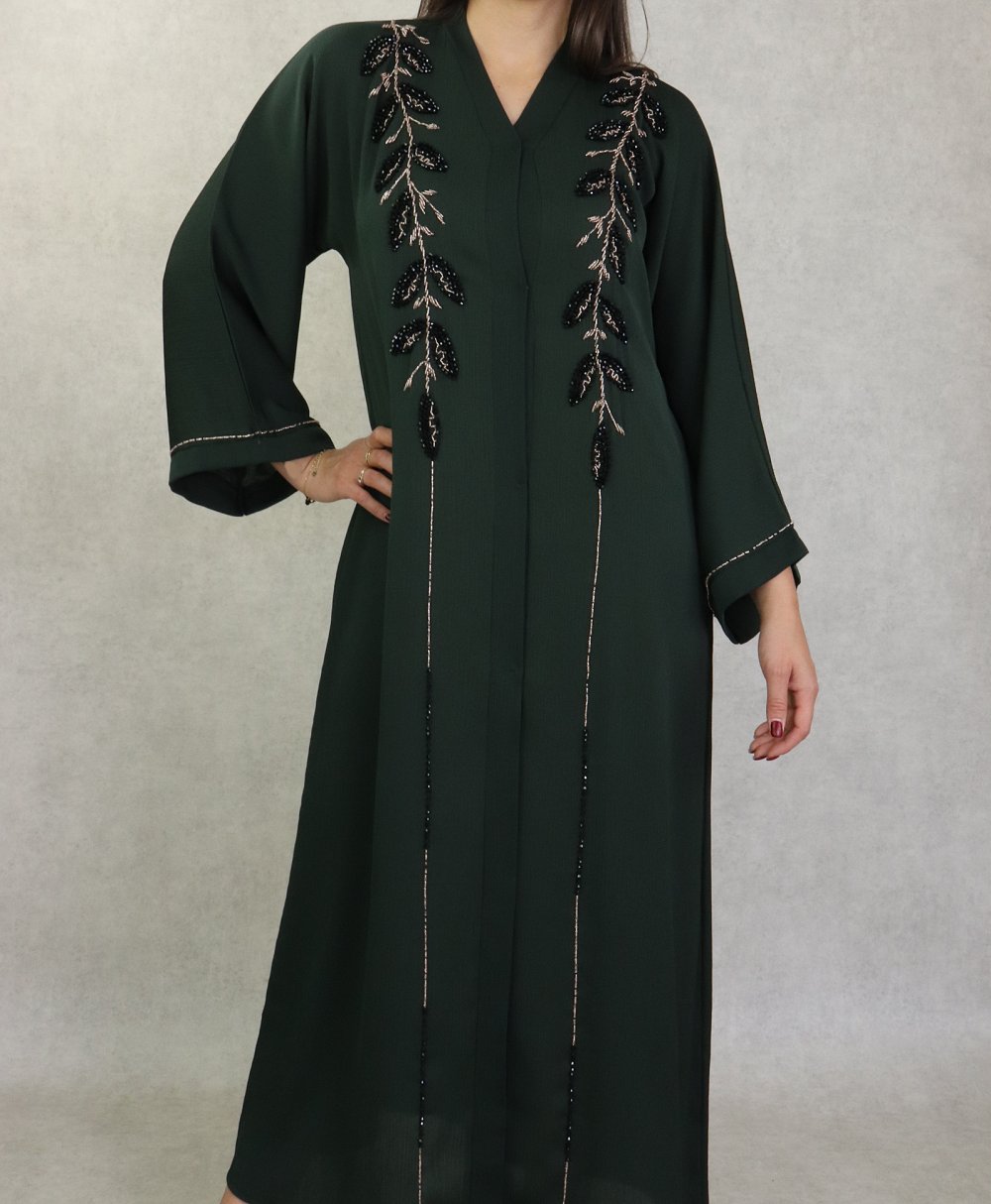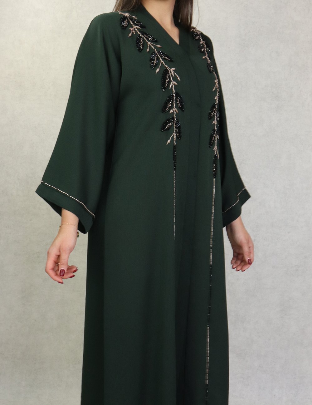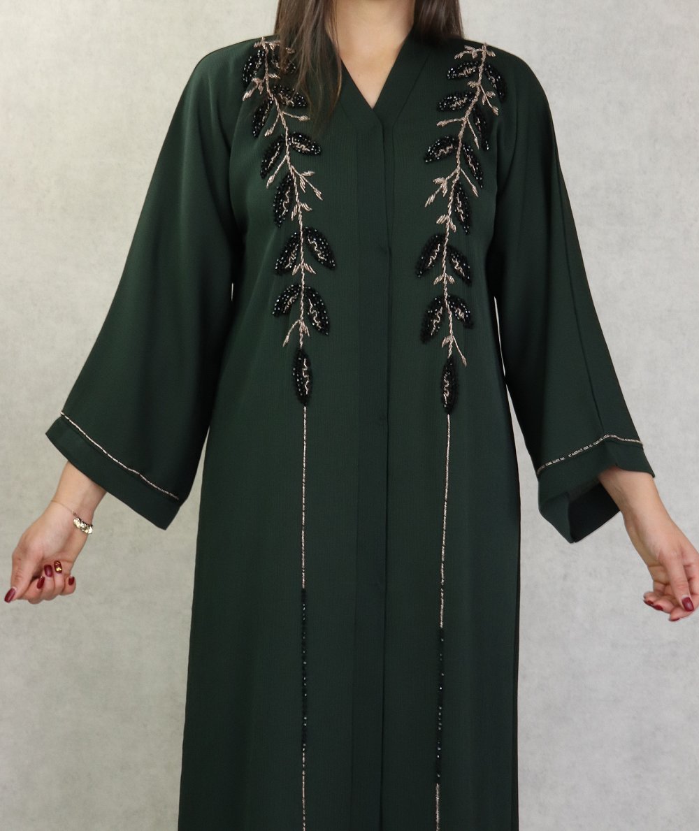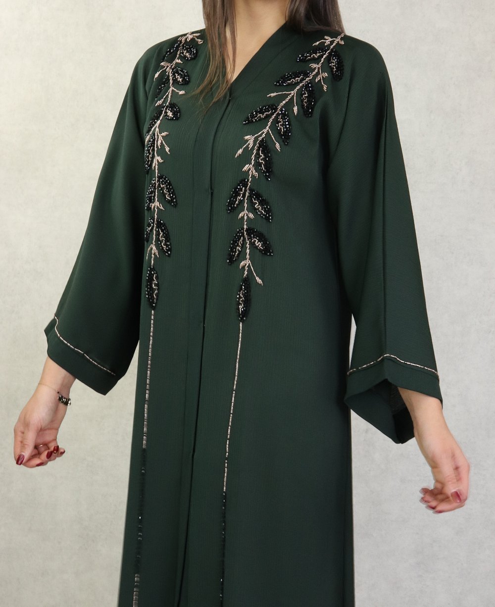 Abaya Dubai brodée à la main ouverte sur tout le long (fermeture à l'avant avec boutons pression) fournie avec son châle assorti.