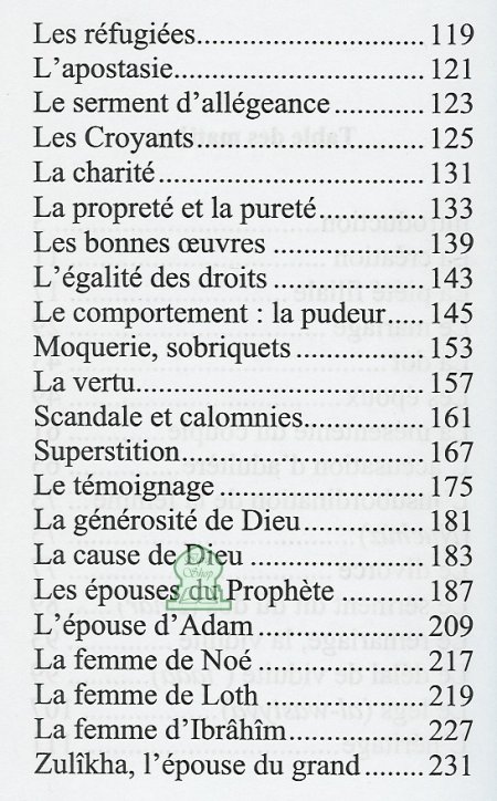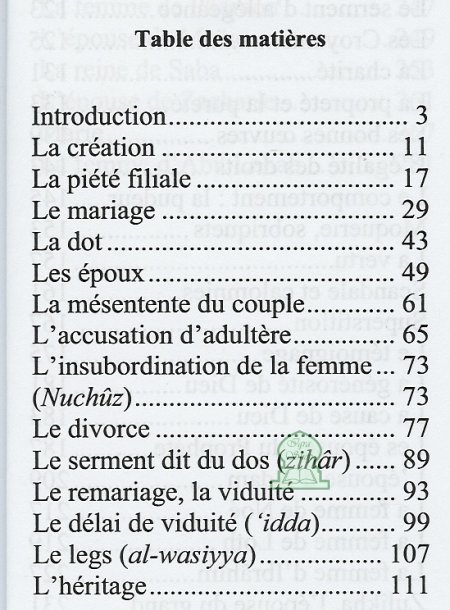 Le présent livre est la somme des versets coraniques qui traitent de la question de la femme. Il comporte deux parties : La première expose les thèmes essentiels qui s'y rapportent et clarifie la position de l'Islam sur des sujets aussi divers que l'égalité entre l'homme et la femme, le mariage, les relations au sein du couple, les règles de comportement, le rôle social de la femme, etc... La deuxième partie donne des exemples concrets de ce que fut à travers l'histoire, le rôle de certaines femmes, comme les épouses des Prophètes ou d'autres femmes encore qui eurent à jouer un rôme important dans la vie de ceux-ci.