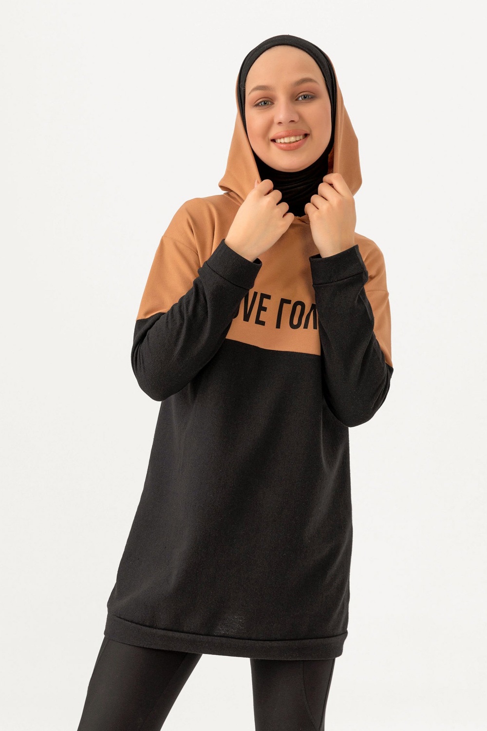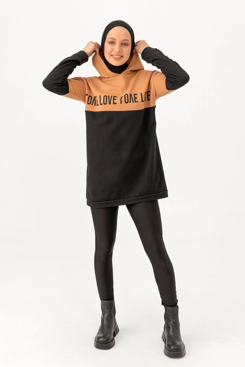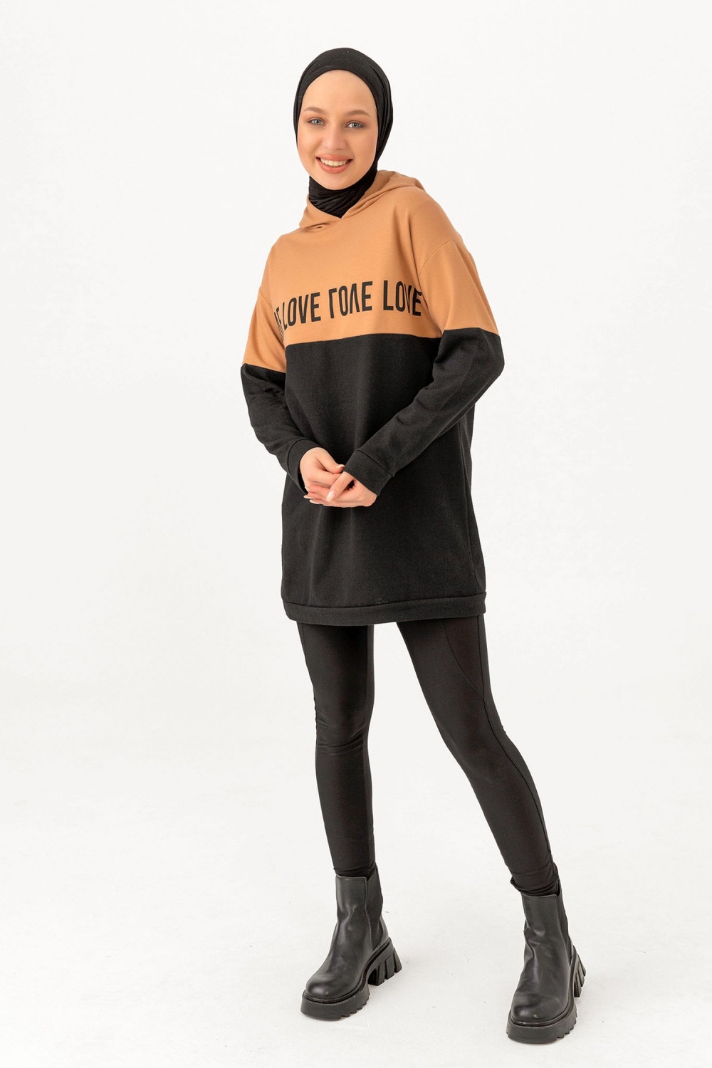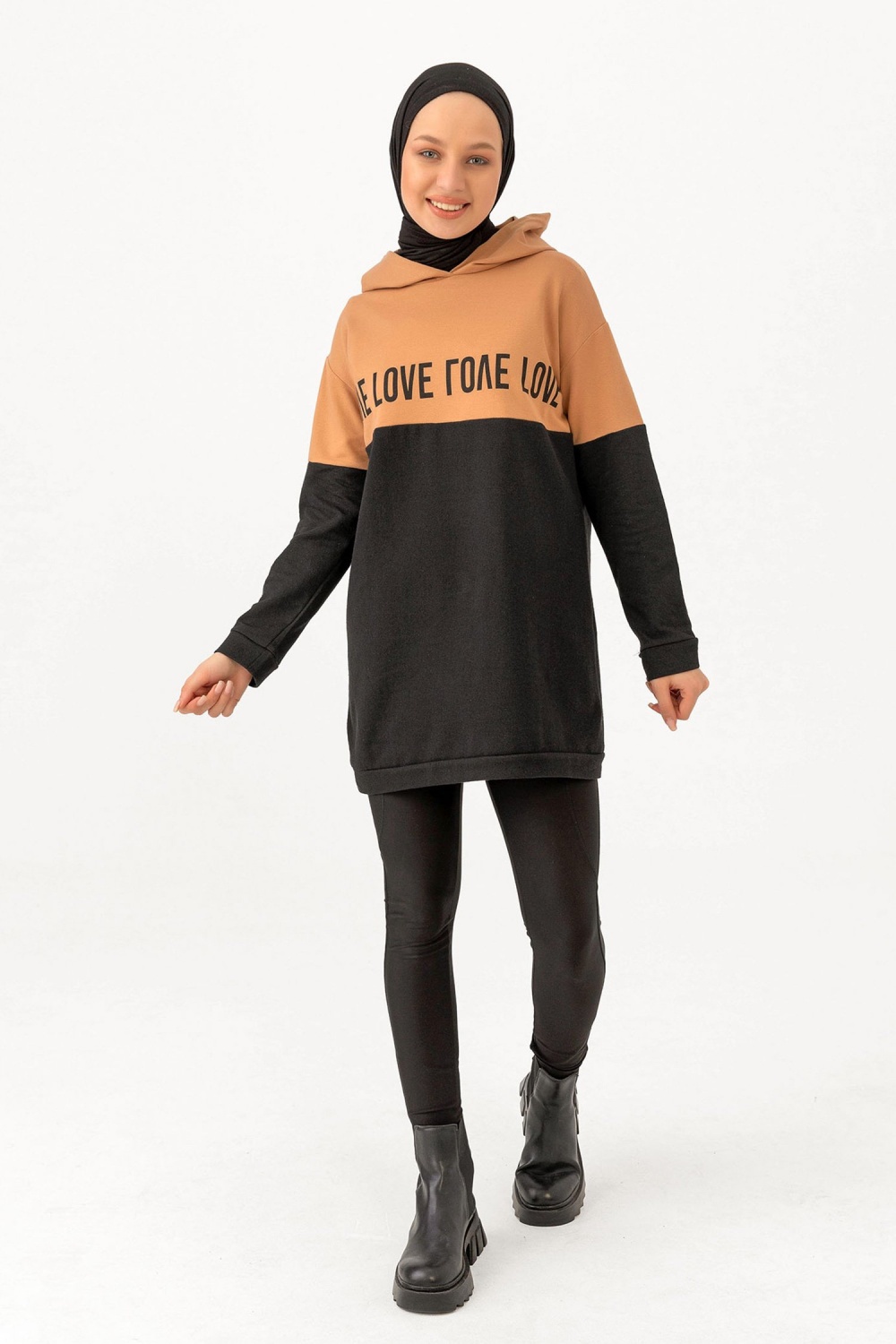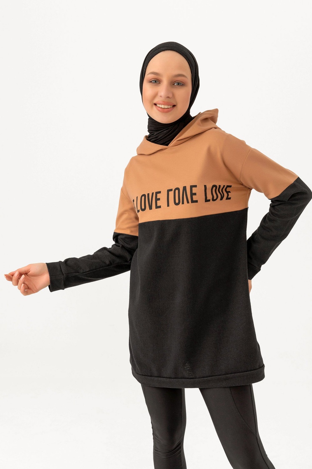Tunique avec capuche pour femme (Sweat-shirt moderne avec inscription Love) - Couleur noir et biscuit Vetement & Accessoire