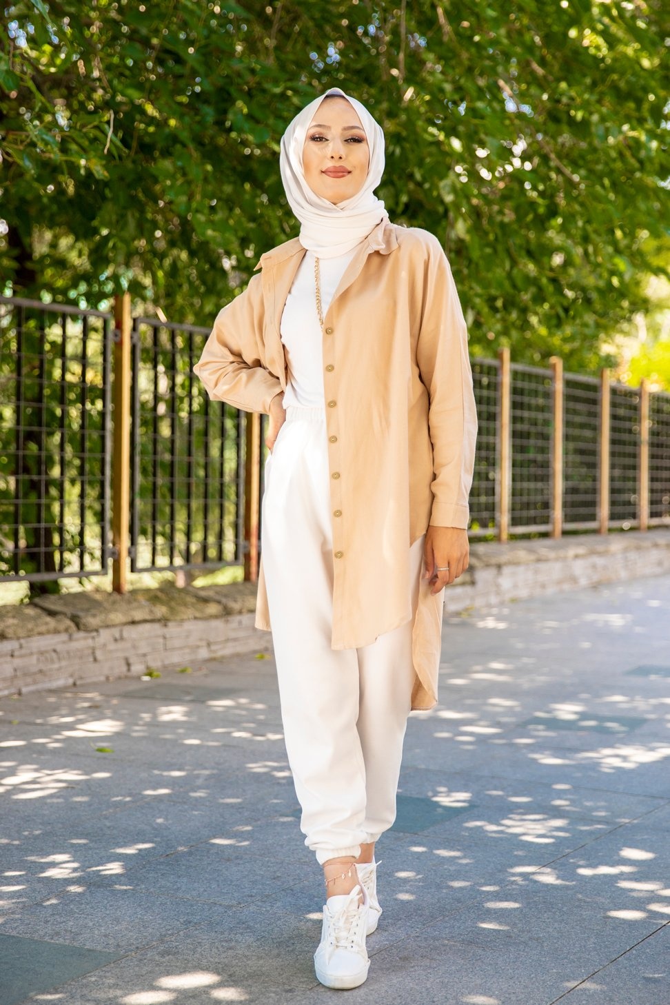 Chemise longe pour femme (Vetement style chic pour hijab) - Couleur beige