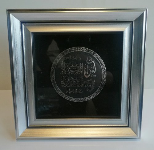 Tableau en bois argenté avec Sourate Ya-Sin. position posé sur un meuble.