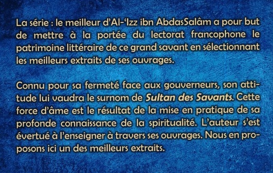 La série : le meilleur d' Al 'Izz Ibn AbdasSalâm a pour but de mettre à la portée du lectorat francophone le patrimoine littéraire de ce grand savant en sélectionnant les meilleurs extraits de ses ouvrages.