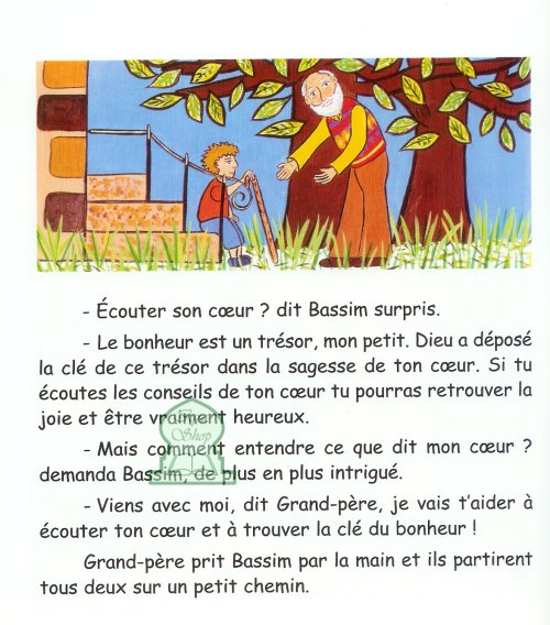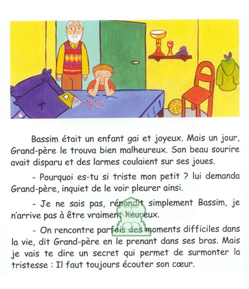 Bassim, dont le joli nom signife « souriant », est tout triste aujourd’hui. Mais il ne sait pas quelle est la raison de son chagrin. Grand-père se penche sur lui avec amour et l’amène à découvrir en son cœur le secret du bonheur.