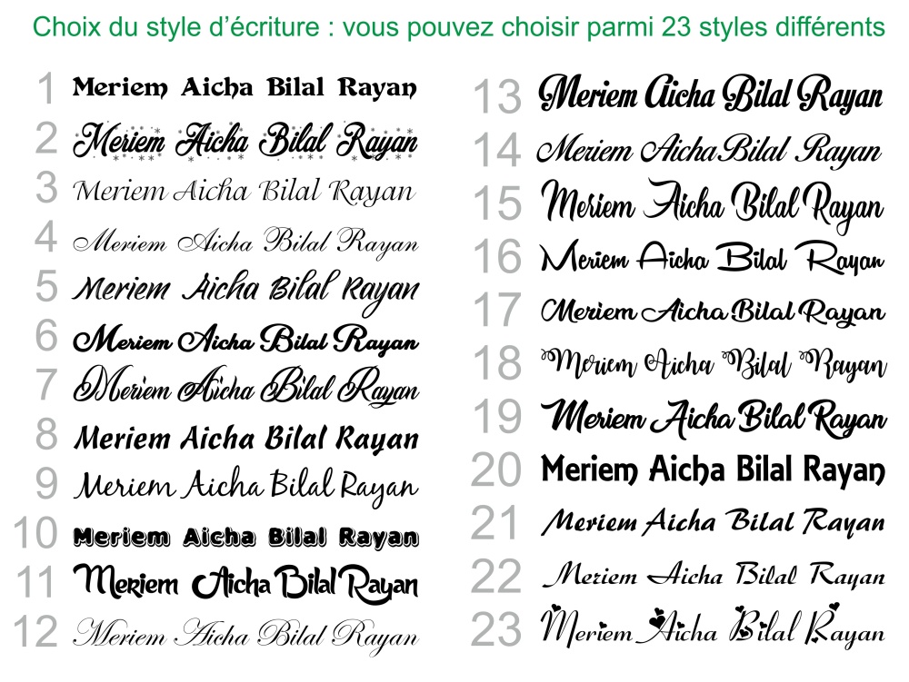 Vous pouvez choisir l'endroit de l'impression du prénom. L'écriture ne s'efface pas même après plusieurs lavages en machine à laver. La couleur d'écriture sera adaptée au tapis.
