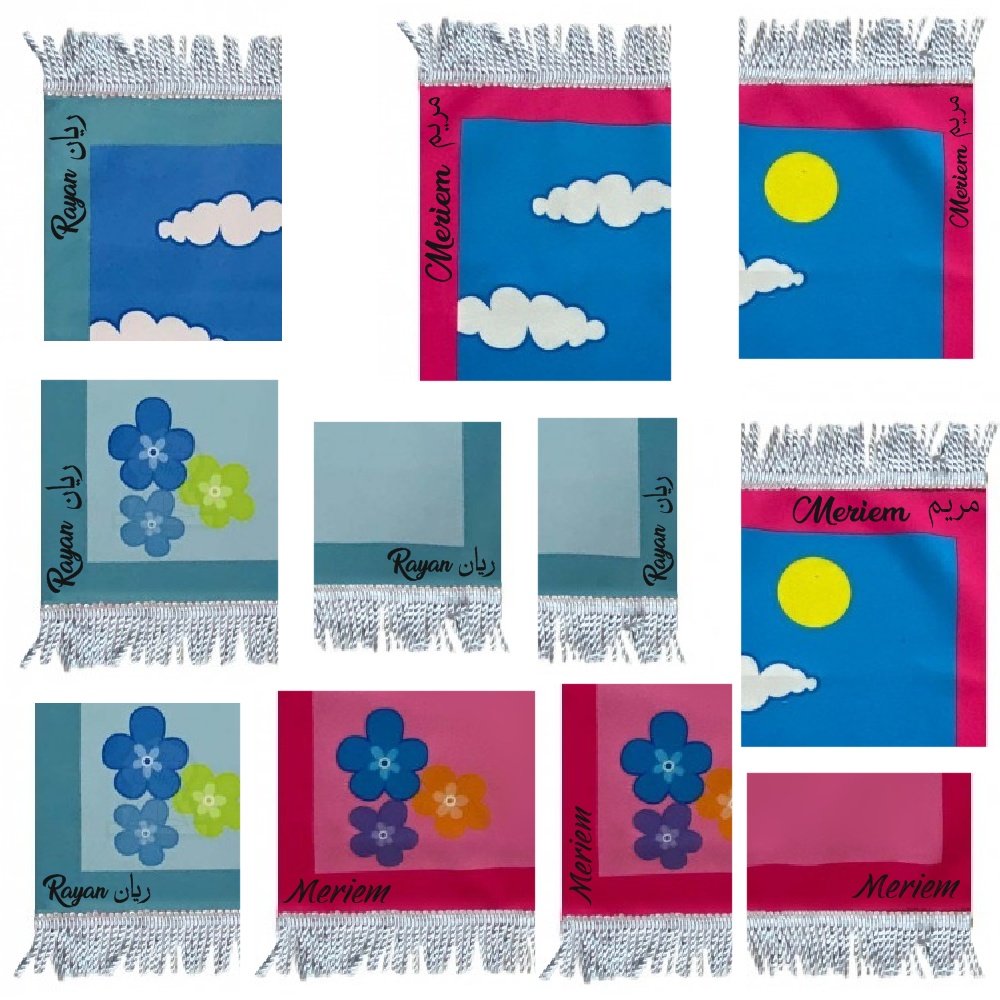 Tapis de prière personnalisé avec un prénom écrit en français ou en "français+arabe" ou en arabe seulement, une idée cadeau pour faire plaisir à offrir à une fille...