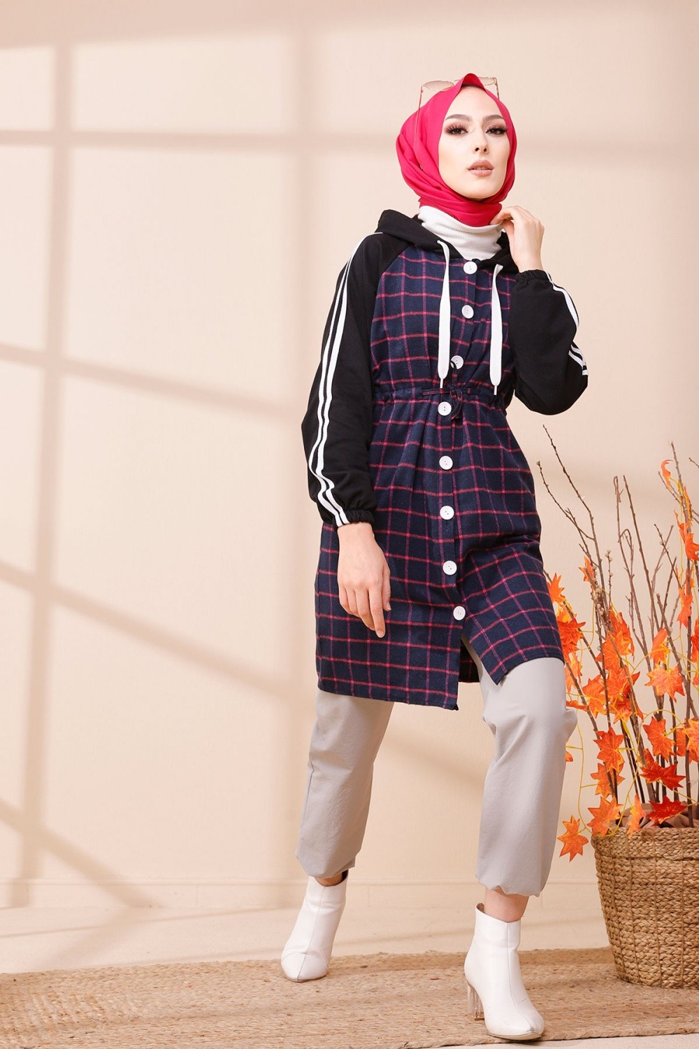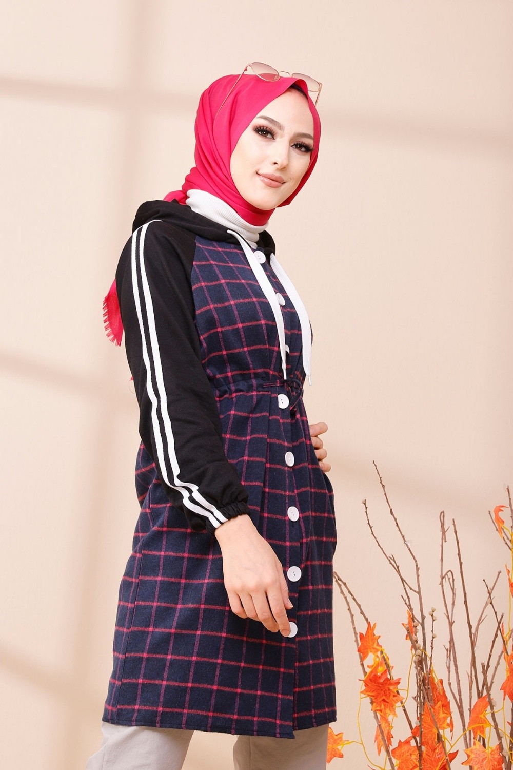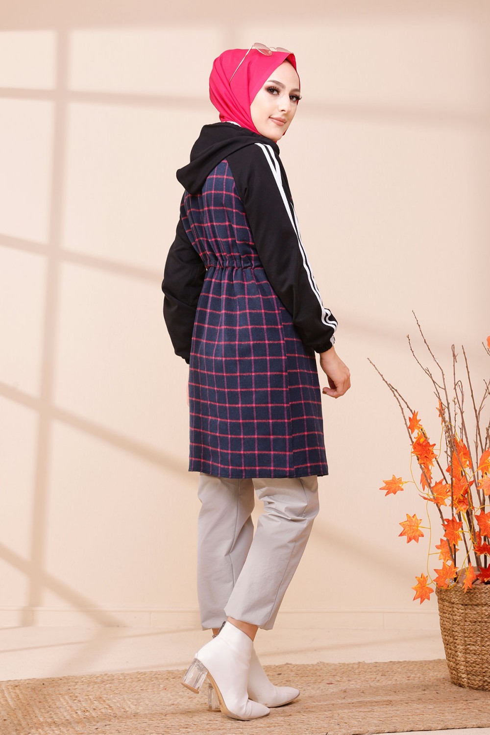 Tunique avec capuche pour femme (Vêtement hijab moderne) - Couleur noir, bleu marine à rayures roses Vetement & Accessoire