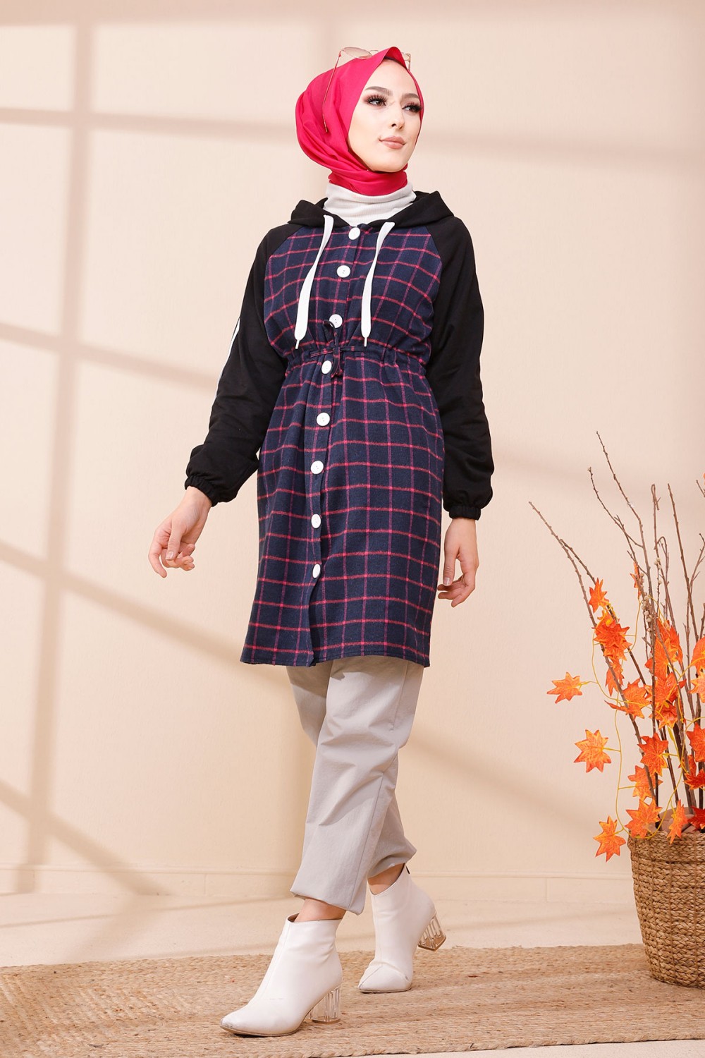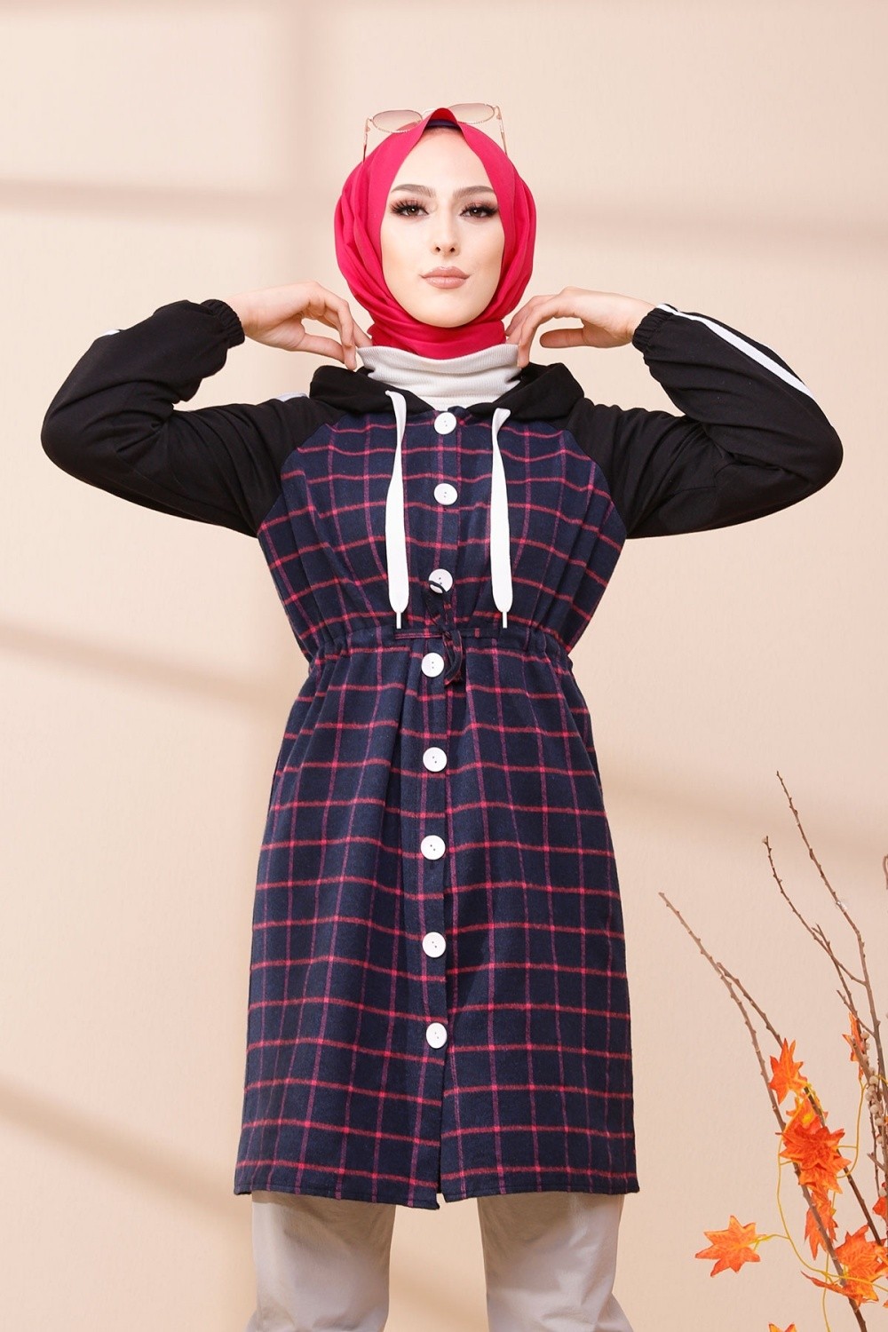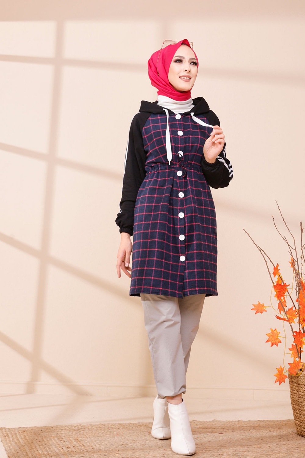 Tunique avec capuche pour femme (Vêtement hijab moderne) - Couleur noir, bleu marine à rayures roses Vetement & Accessoire