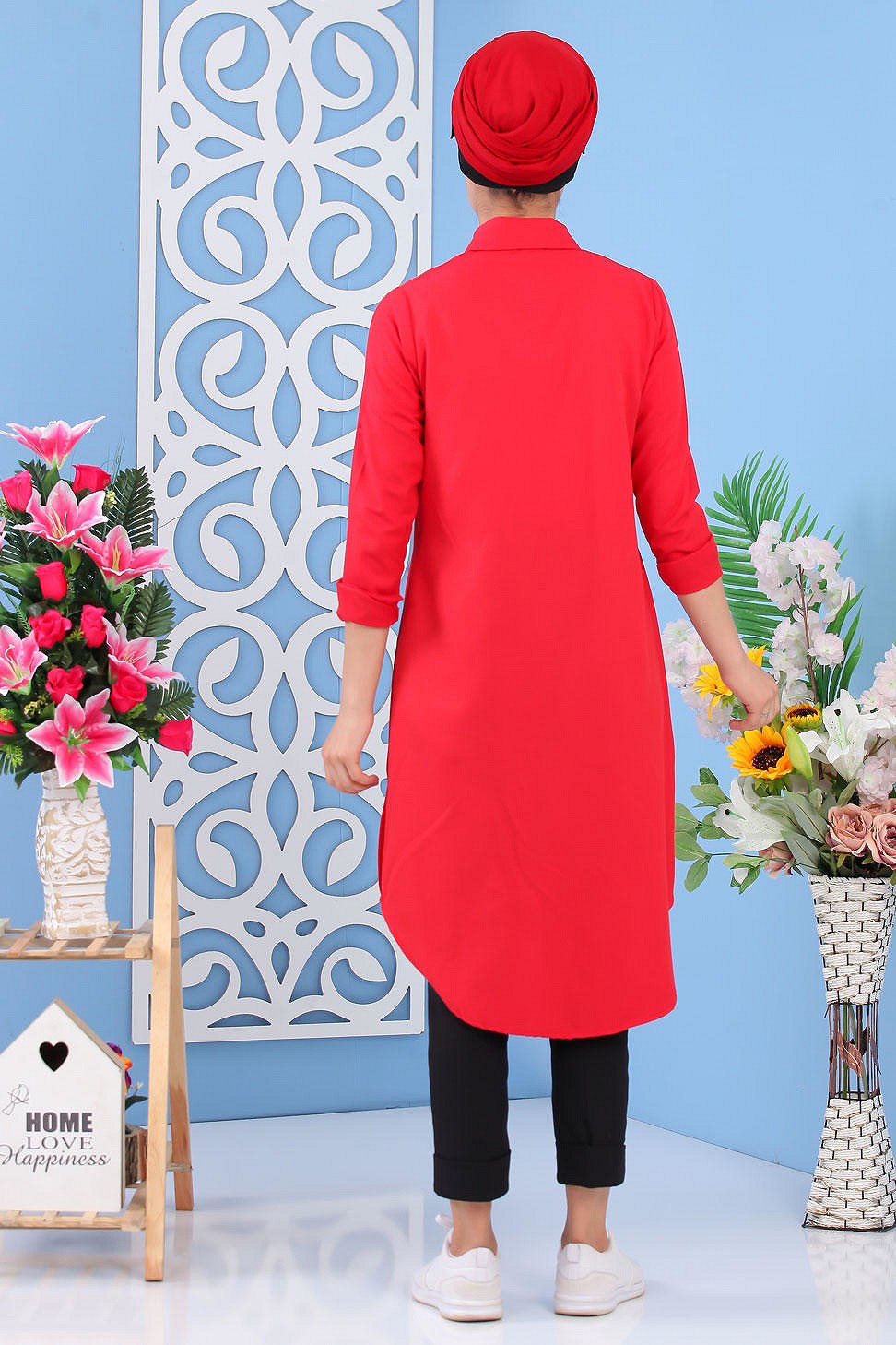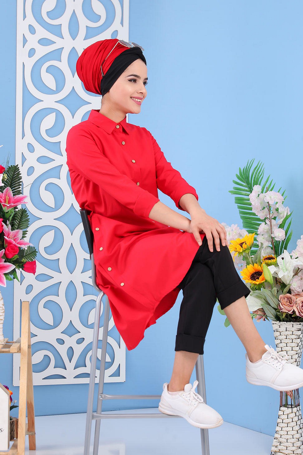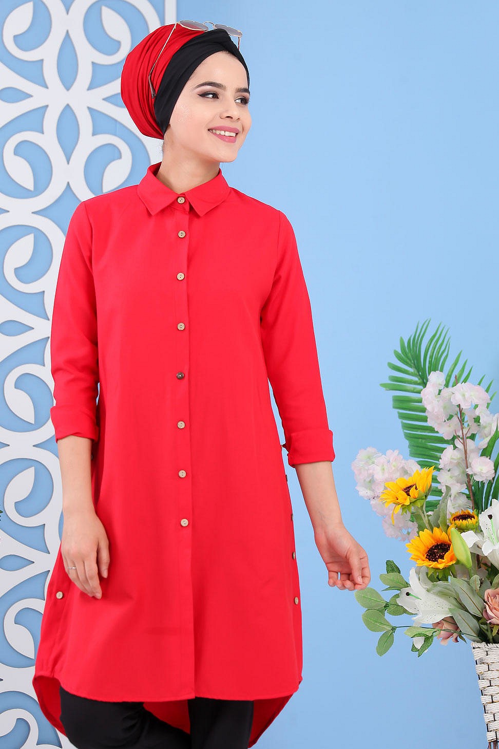 Tunique chemise longue décoration boutons pour femme - Couleur rouge Vetement & Accessoire