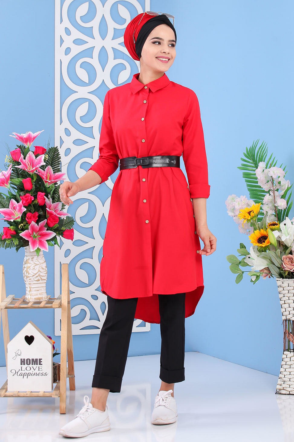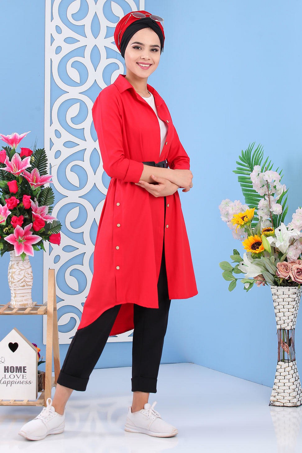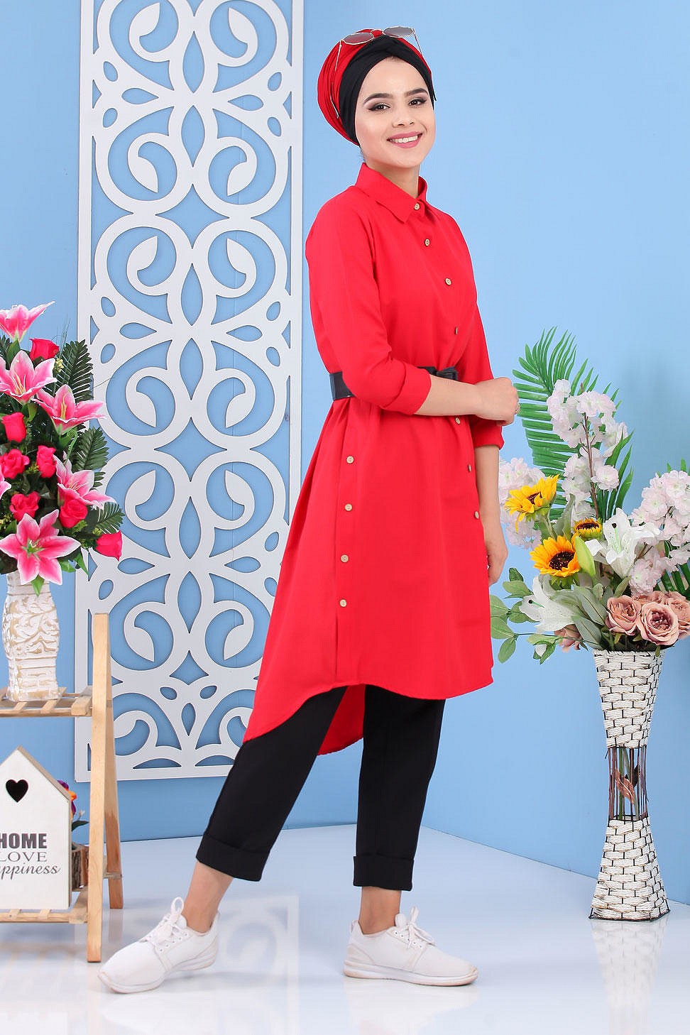 Tunique chemise longue décoration boutons pour femme - Couleur rouge Vetement & Accessoire