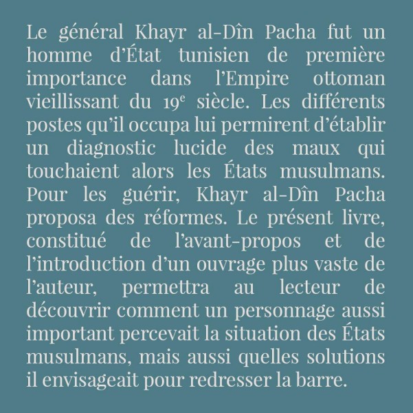 Le général Khayr al-Dîn Pacha fut un homme d'État tunisien de première importance dans l'Empire ottoman vieillissant du 19e siècle. Les différents postes qu'il occupa lui permirent d'établir un diagnostic lucide des maux qui touchaient alors les États musulmans. Pour les guérir, Khayr al-Dîn Pacha proposa des réformes. Le présent livre, constitué de l'avant-propos et de l'introduction d'un ouvrage plus vaste de l'auteur permettra au lecteur de découvrir comment un personnage aussi important percevait la situation des États musulmans, mais aussi quelles solutions il envisageait pour redresser la barre.