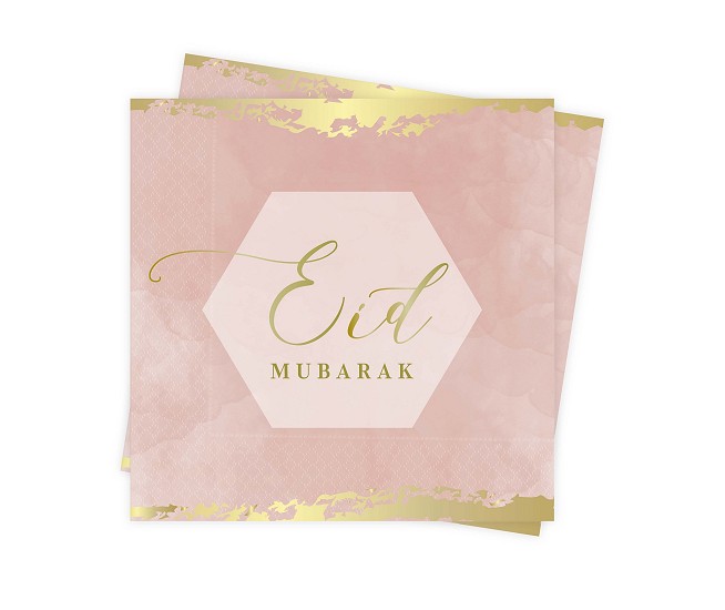 Les serviettes en papier sont imprimées avec inscription «Eid Mubarak» + bordures en rose dorée.