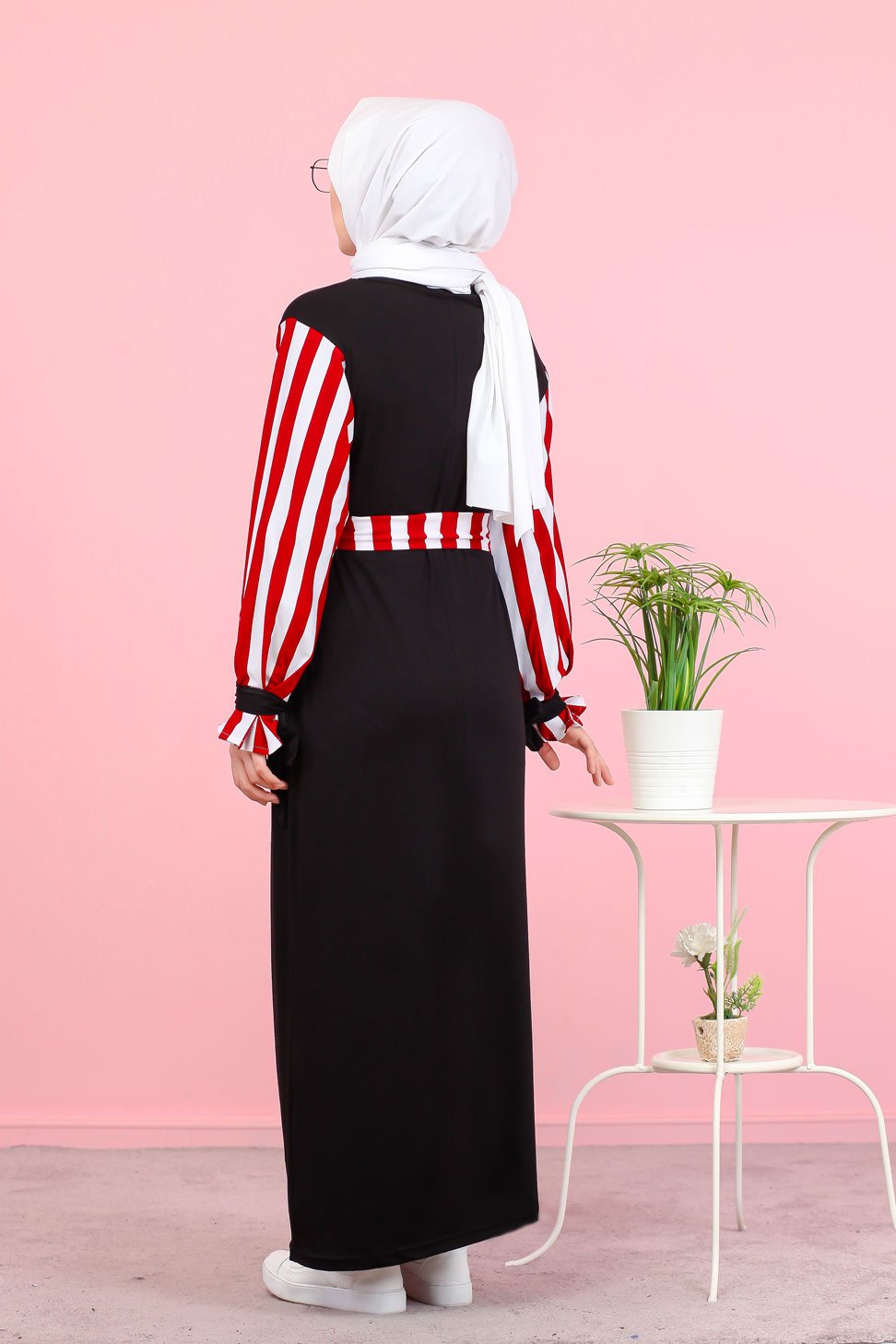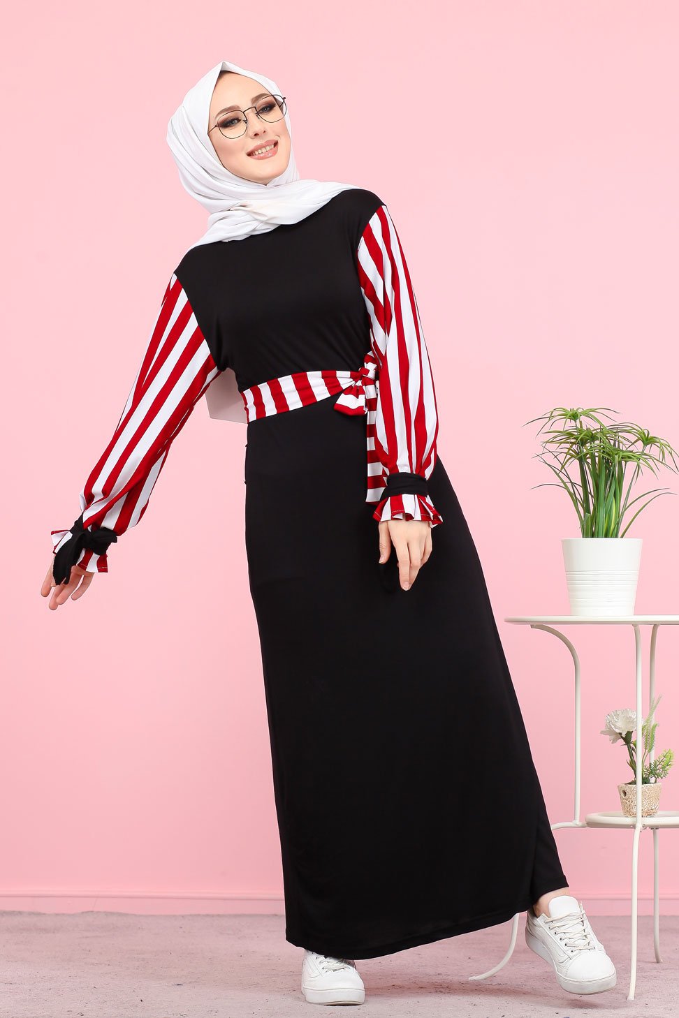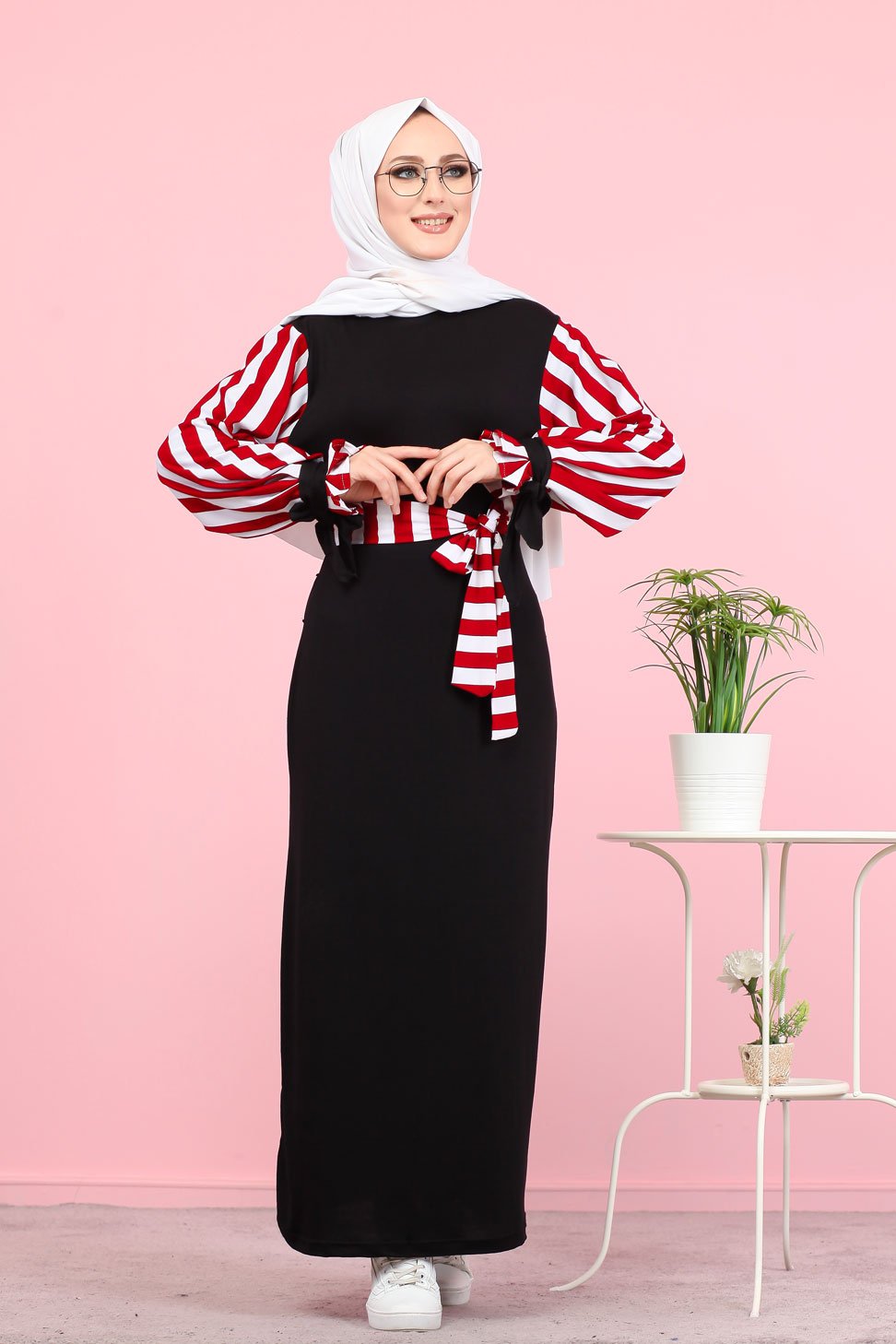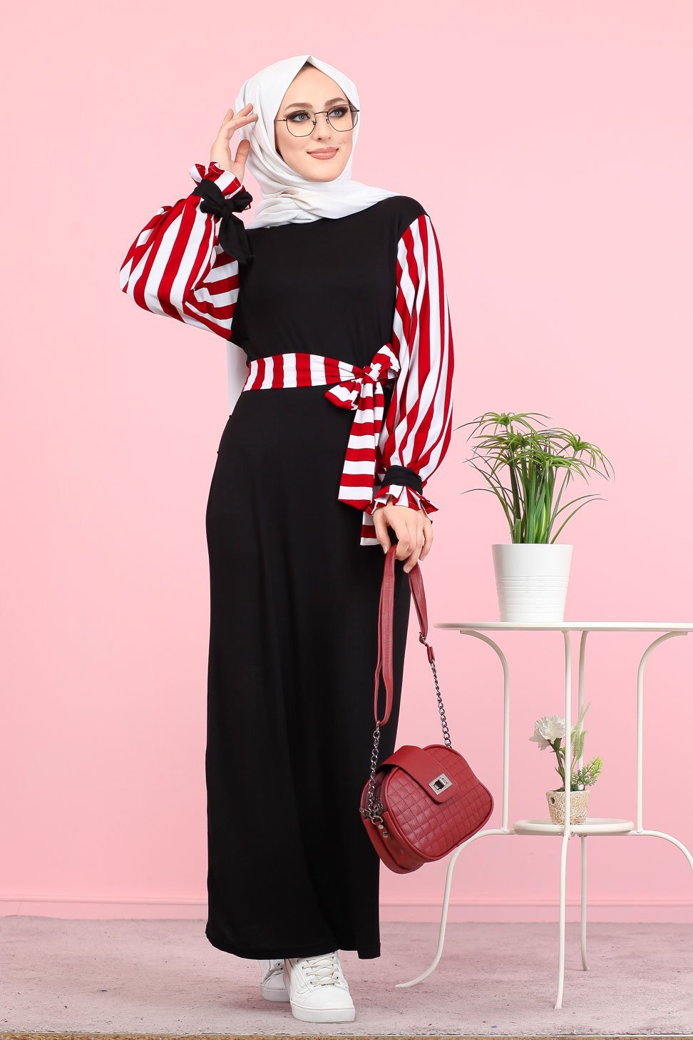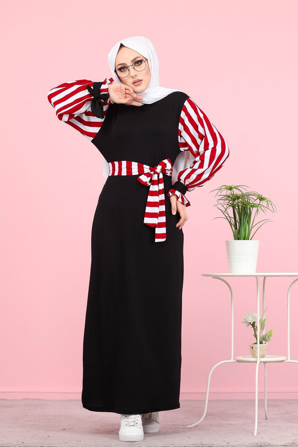 Robe longue noire avec manches et ceinture a rayures rouge et blanches