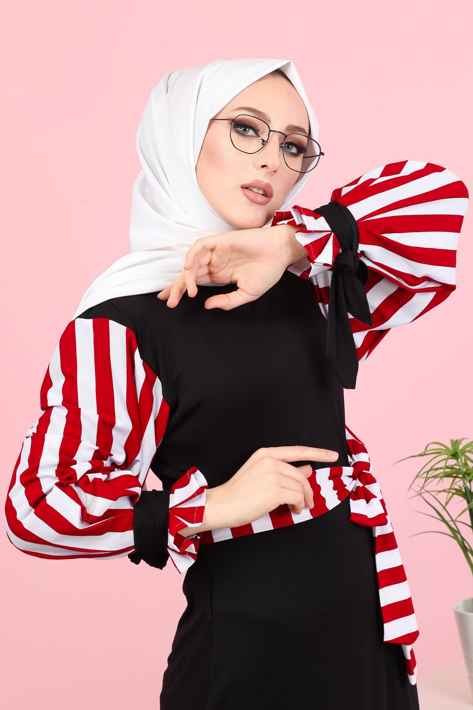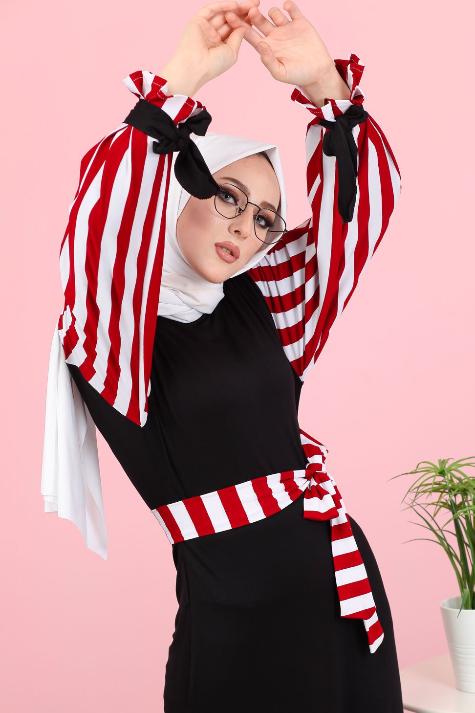 Robe longue noire avec manches et ceinture à rayures rouge et blanches Vetement & Accessoire