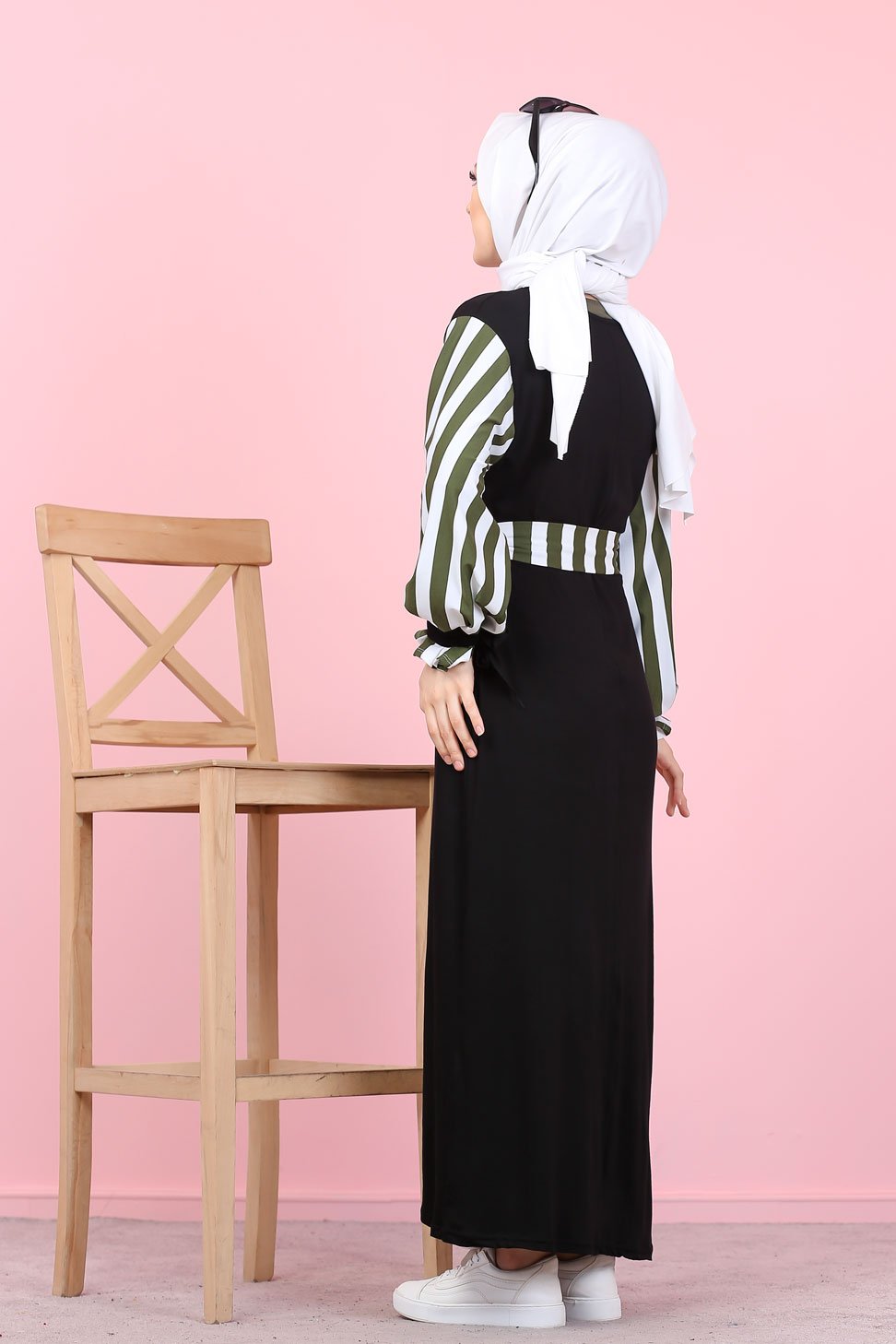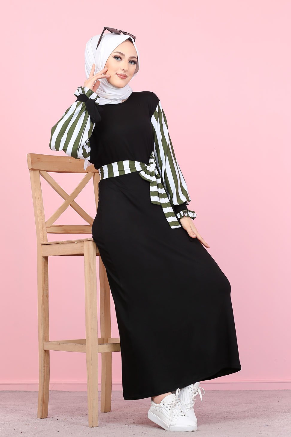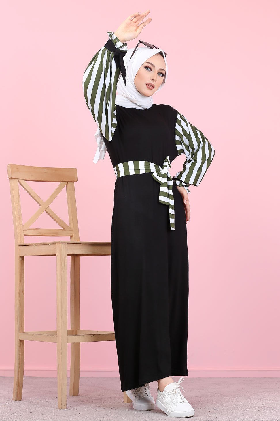Robe longue noire, coupe droite, encolure ronde, manches à rayures avec finition lien de serrage aux poignets. Ceinture amovible retenu par des passons en tissu.
