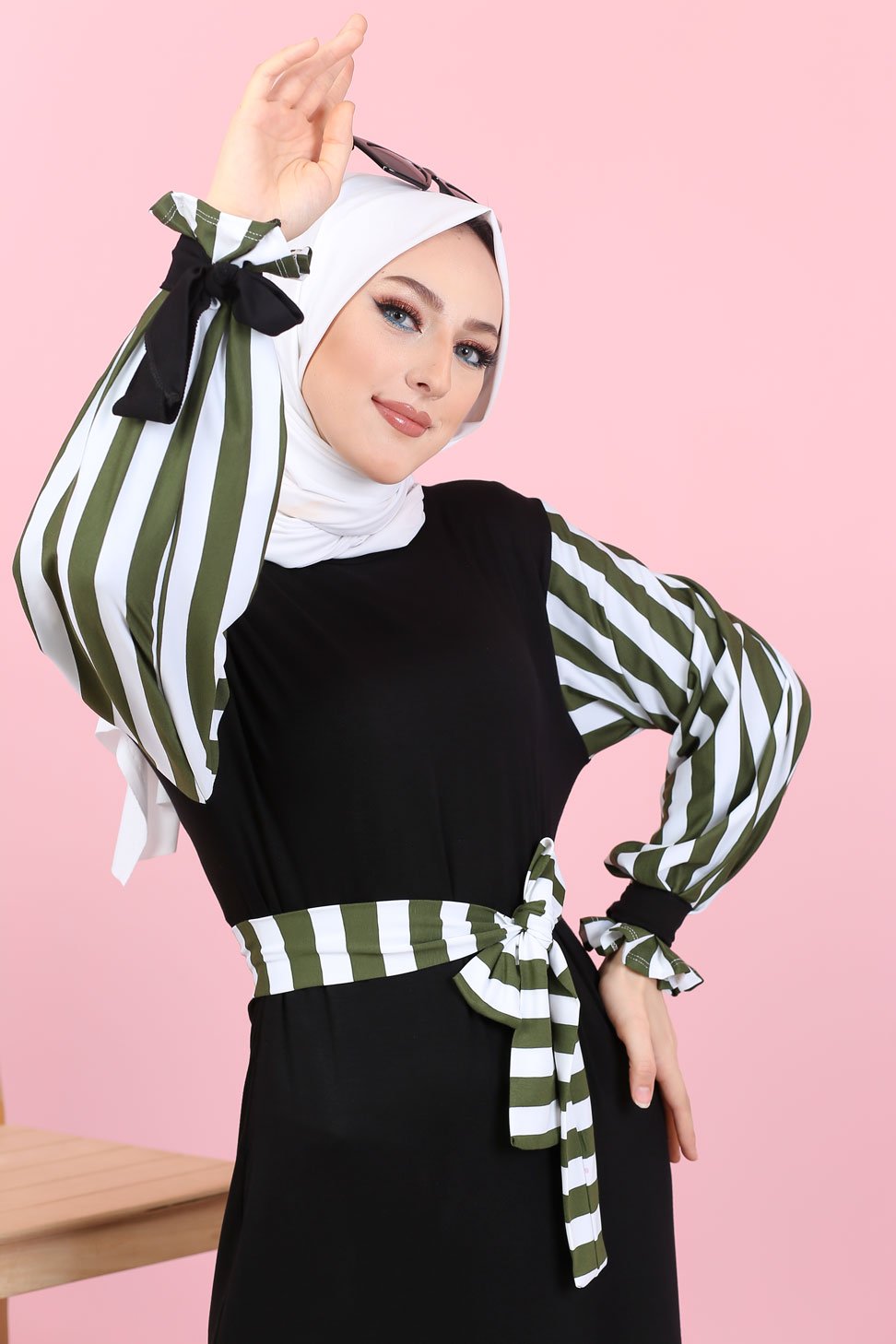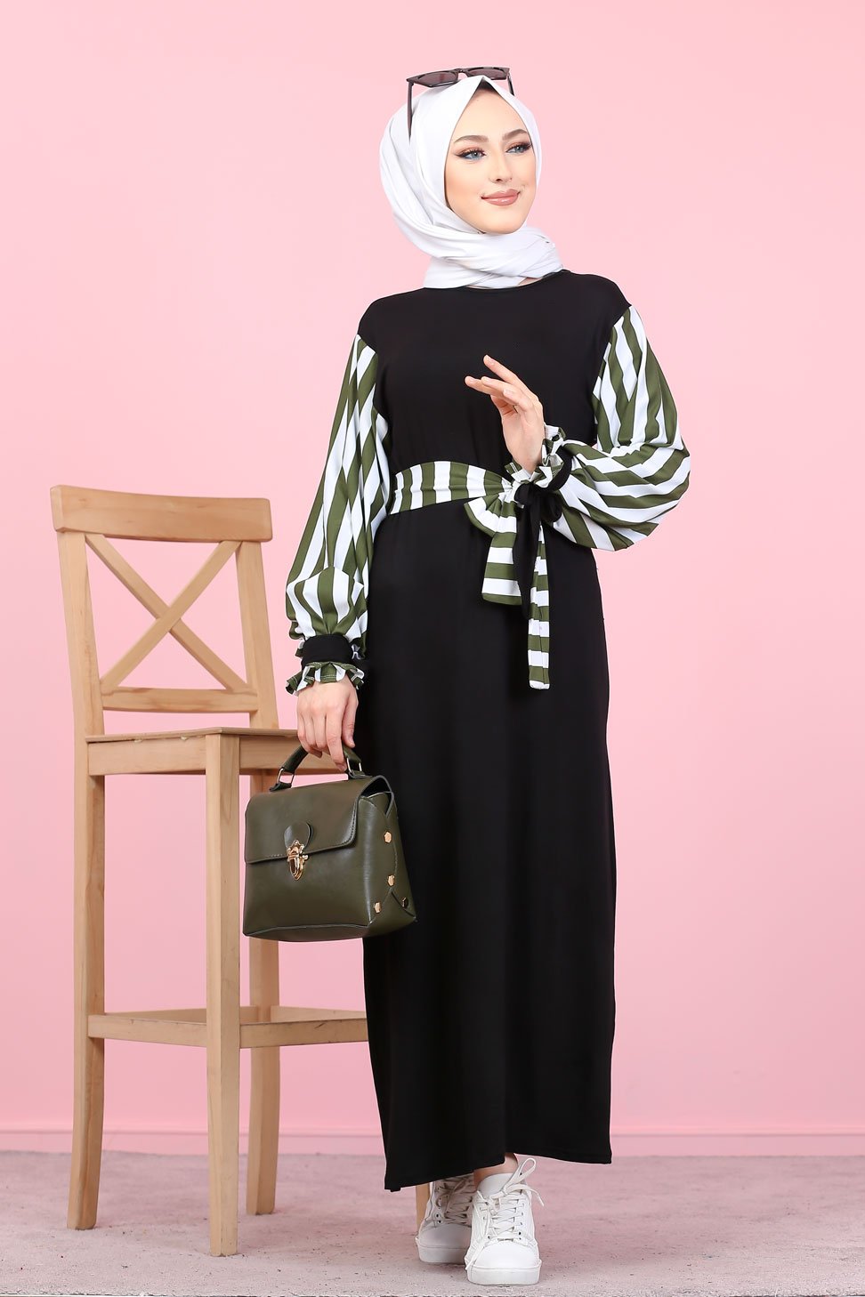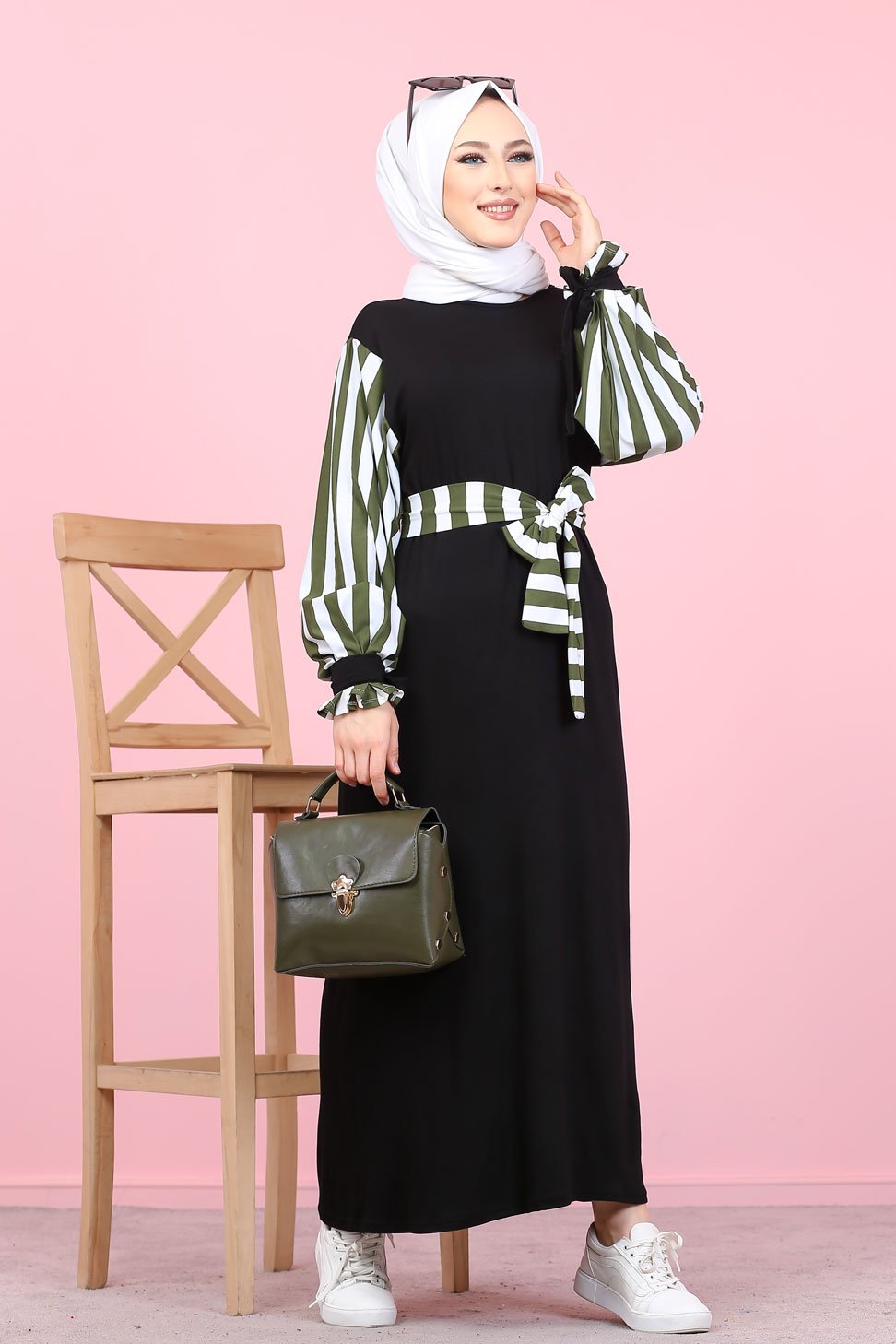 Robe longue noire, coupe droite, encolure ronde, manches à rayures avec finition lien de serrage aux poignets. Ceinture amovible retenu par des passons en tissu.