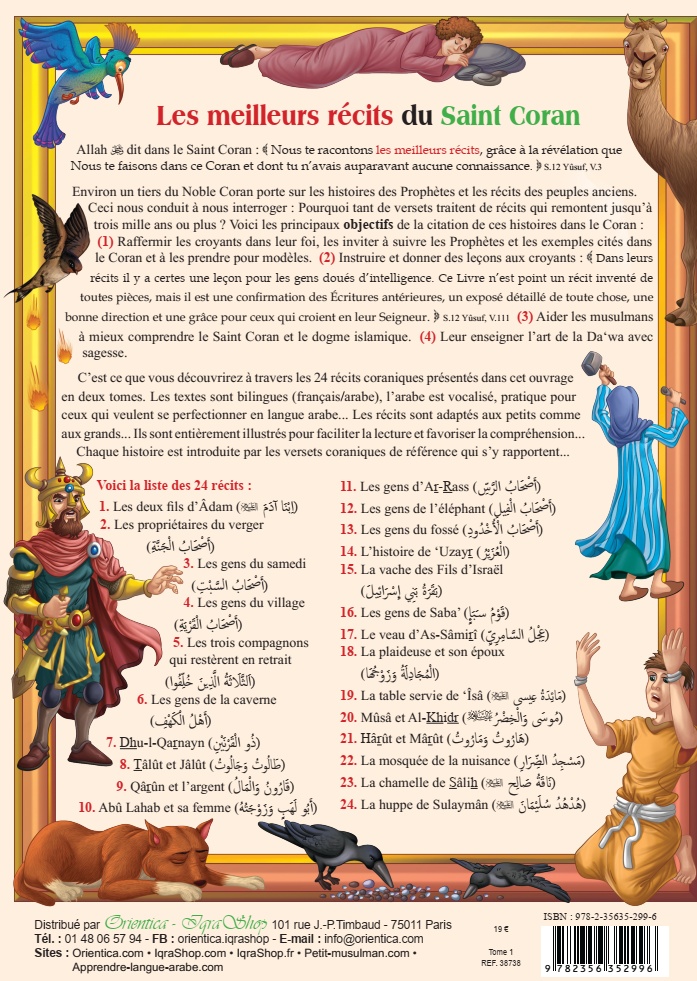 C’est ce que vous découvrirez à travers les 24 récits de ce magnifique ouvrage en deux tomes (chaque tome est indépendant et vendu séparément). Les textes sont bilingues (français/arabe), l’arabe est vocalisé, pratique pour ceux qui veulent se perfectionner en langue arabe... Les récits sont adaptés aux petits comme aux grands... Ils sont entièrement illustrés pour faciliter la lecture et favoriser la compréhension... Chaque histoire est introduite par les versets coraniques de référence qui s’y rapportent...