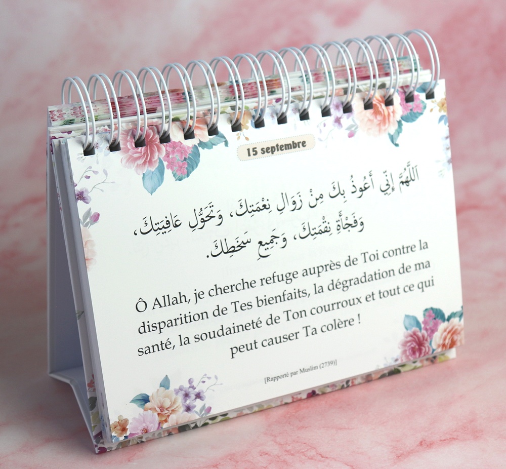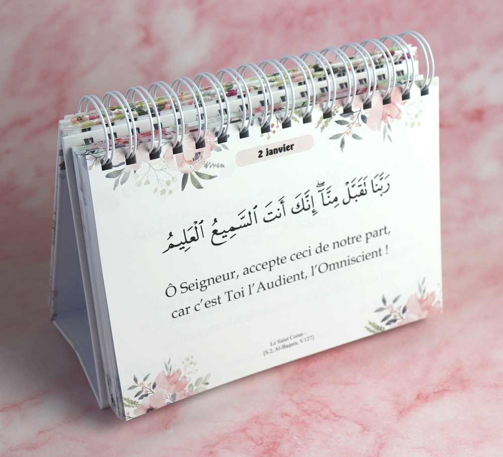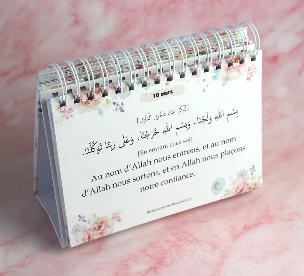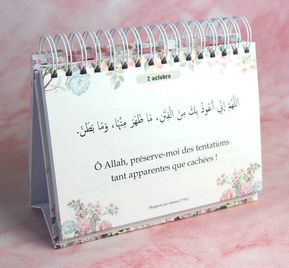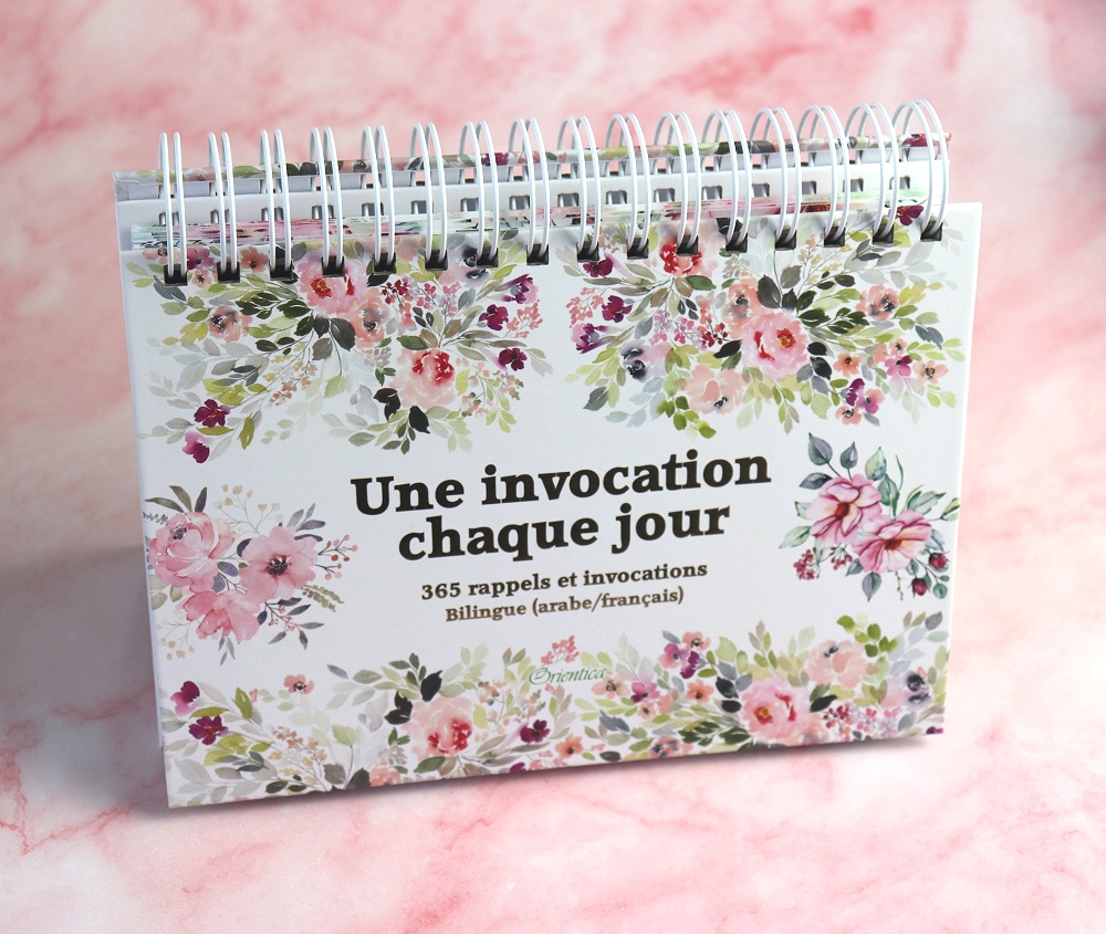 Une invocation chaque jour est un magnifique calendrier – perpétuel, joliment illustré à motif floral, dont les cadres raffinés défilent au fil des mois - qui, comme son nom l’indique, comprend 365 invocations tirées du Coran (dont les 40 Rabbanâ), de la Sunna prophétique authentique, et énumère les 99 beaux noms d’Allah par lesquels il sied à tout un chacun de prier le Très-Haut dans l’espoir d’être exaucé, de même que l’invocation de clôture de récitation du Coran que certains préconisent. Chaque invocation - transcrite dans les deux langues : arabe (vocalisé) et français - est rattachée à sa référence sur le Livre divin sacré, ou à ses sources, son ou ses rapporteurs et aux numéros qui lui sont attribués dans les éminents recueils de hadiths.