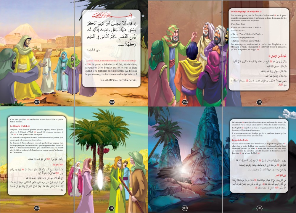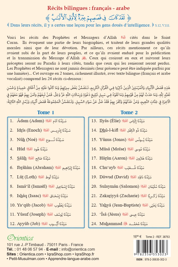 Les Prophètes et Messagers ne sont jamais dessinés (leur présence peut être indiquée parfois par une lumière)... Cet ouvrage en 2 tomes, richement illustré, avec texte bilingue (français et arabe vocalisé) comprend les 24 récits, et le tome 2 comprend les récits suivants :