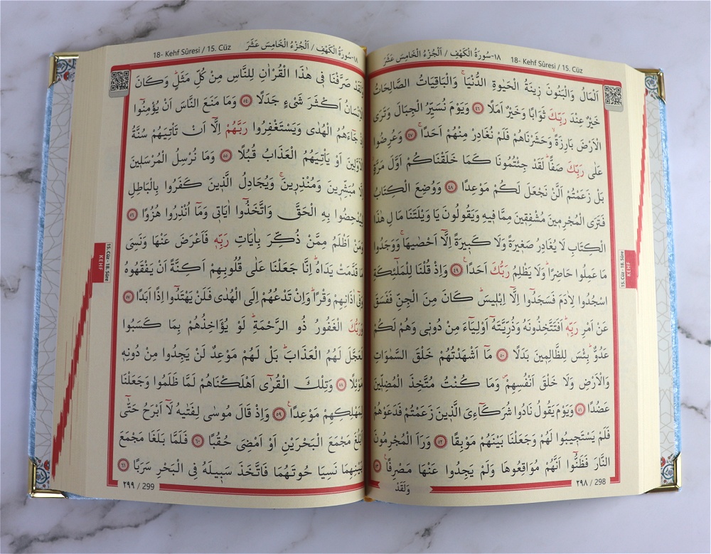 Chaque page contient un code QR qui vous permet de l'écouter avec le récitateur de votre choix ou d'écouter la traduction en français ou autre langues...