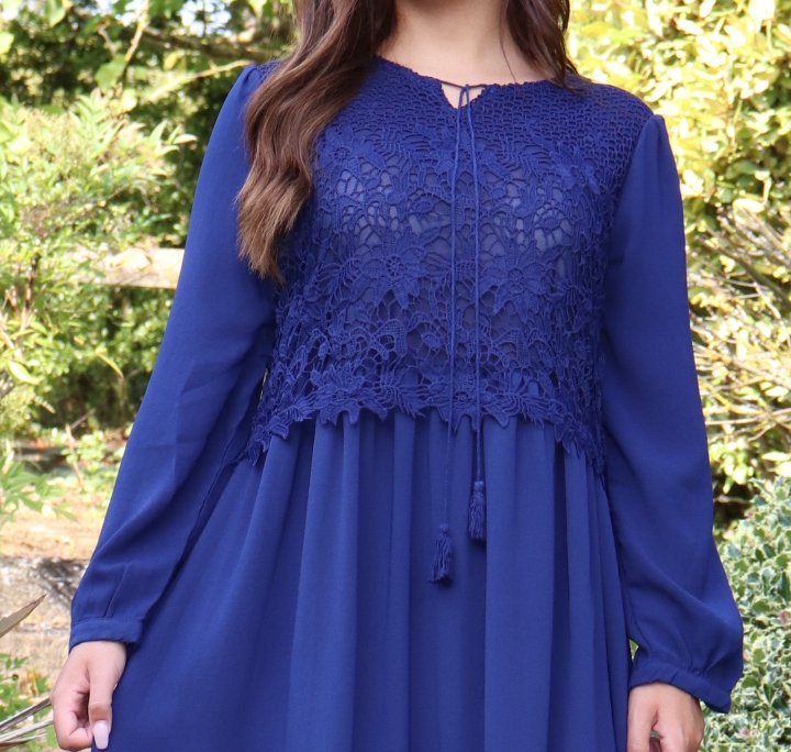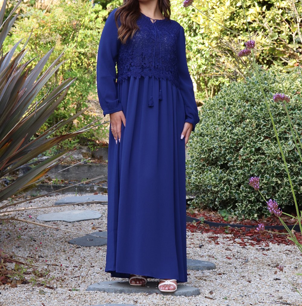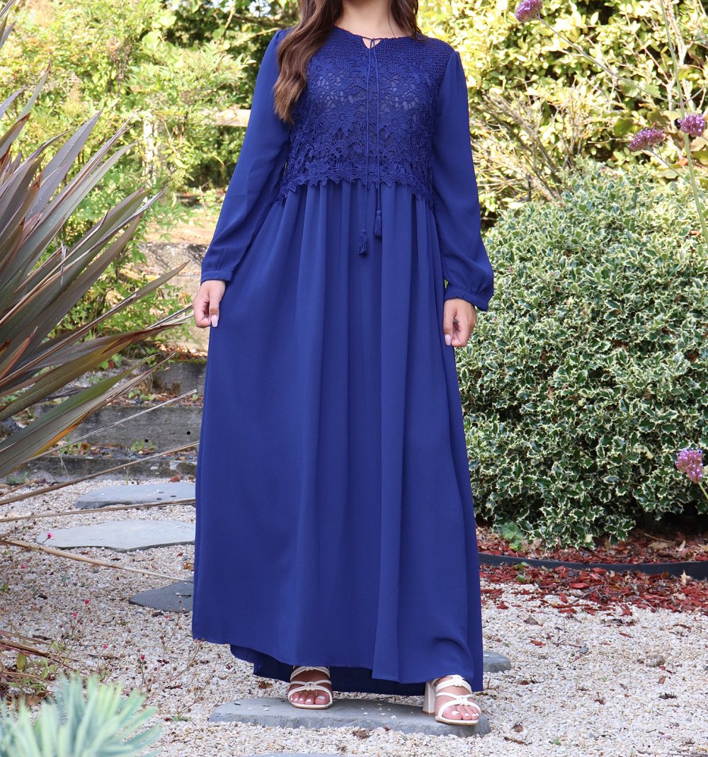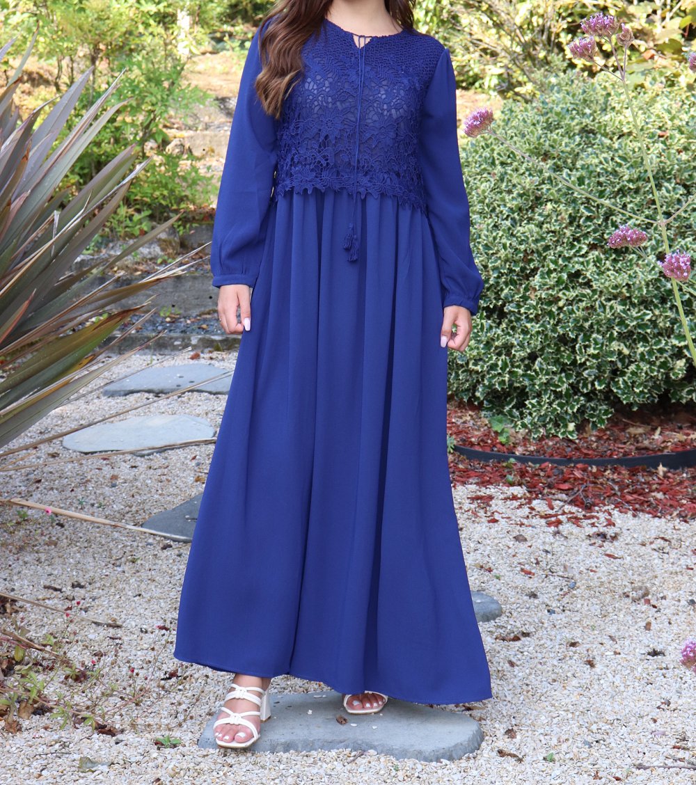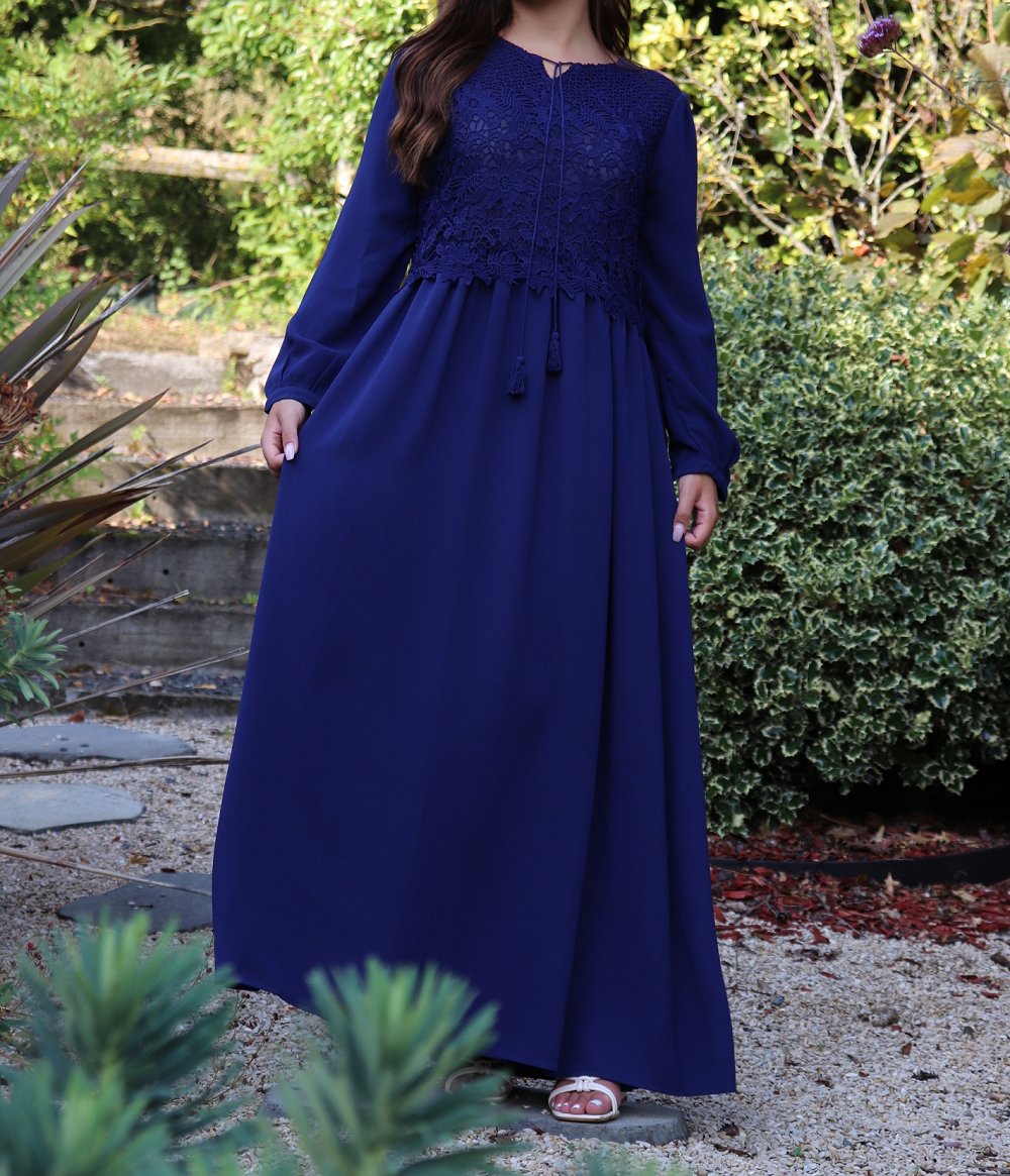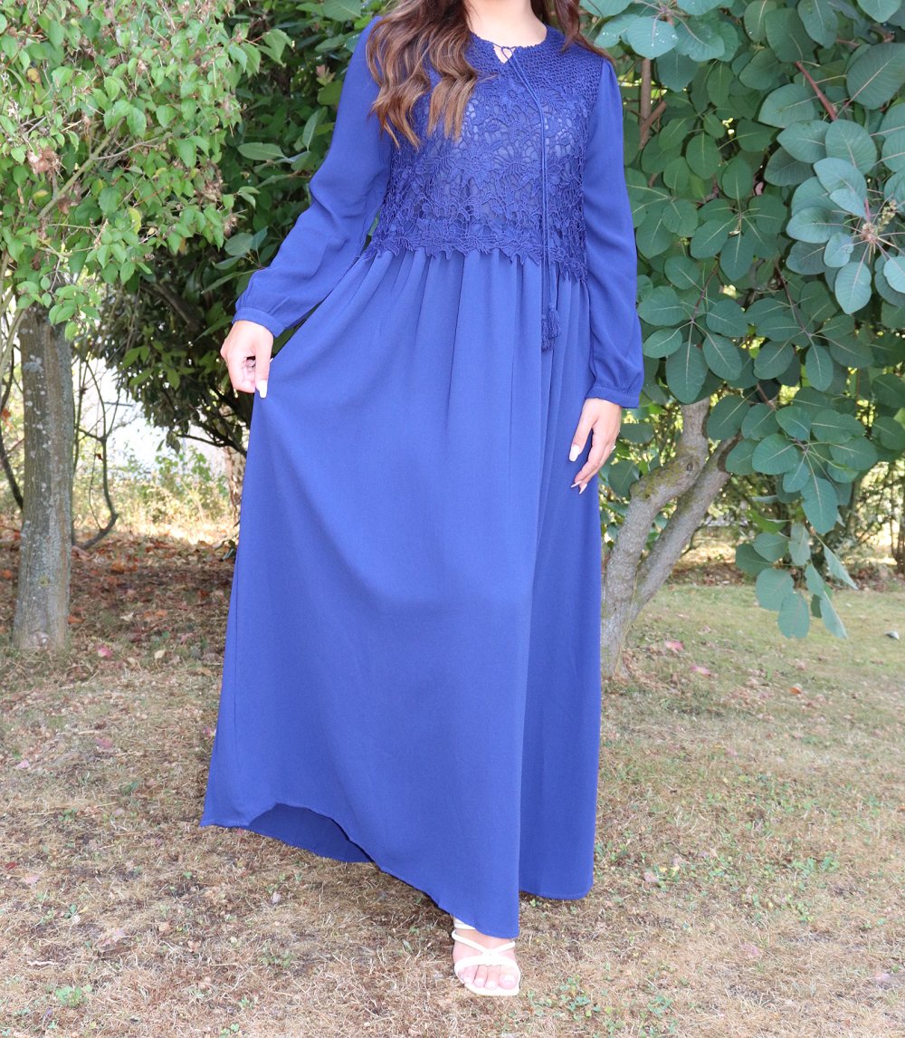 Très belle robe longue taille cintrée. Broderies sur le buste. Coupe évasée vers le bas, entièrement doublée. manches longues finition boutonnée.