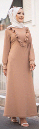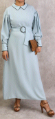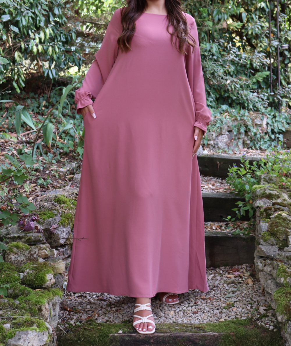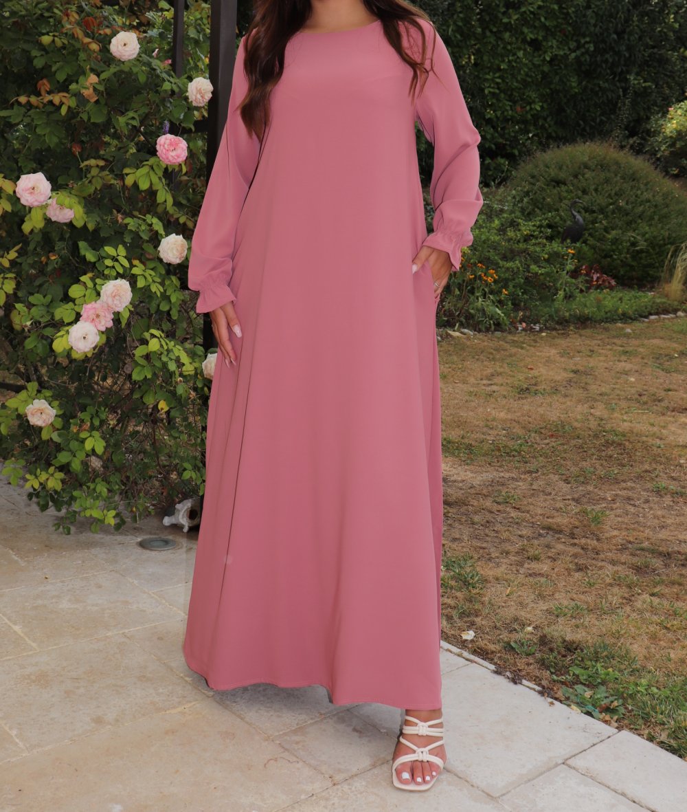 Jolie robe Abaya longue, col rond, coupe évasée, deux poches latérales, tissu nidah noir opaque. Beau tombé et très agréable à porter. Intemporel, elle se porte en toutes saisons, en toutes occasions.