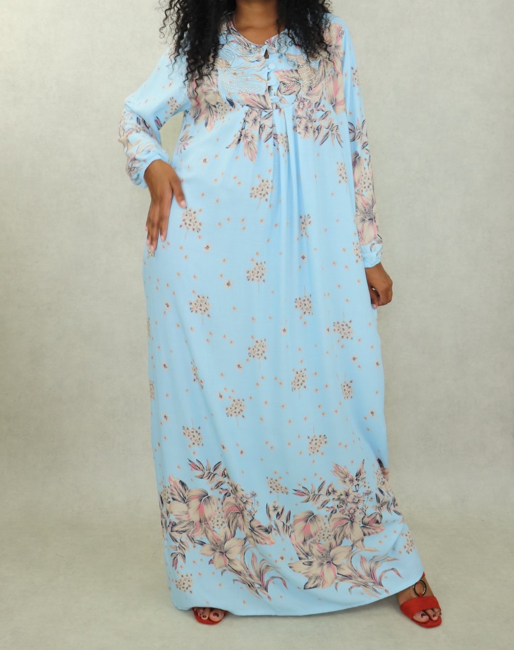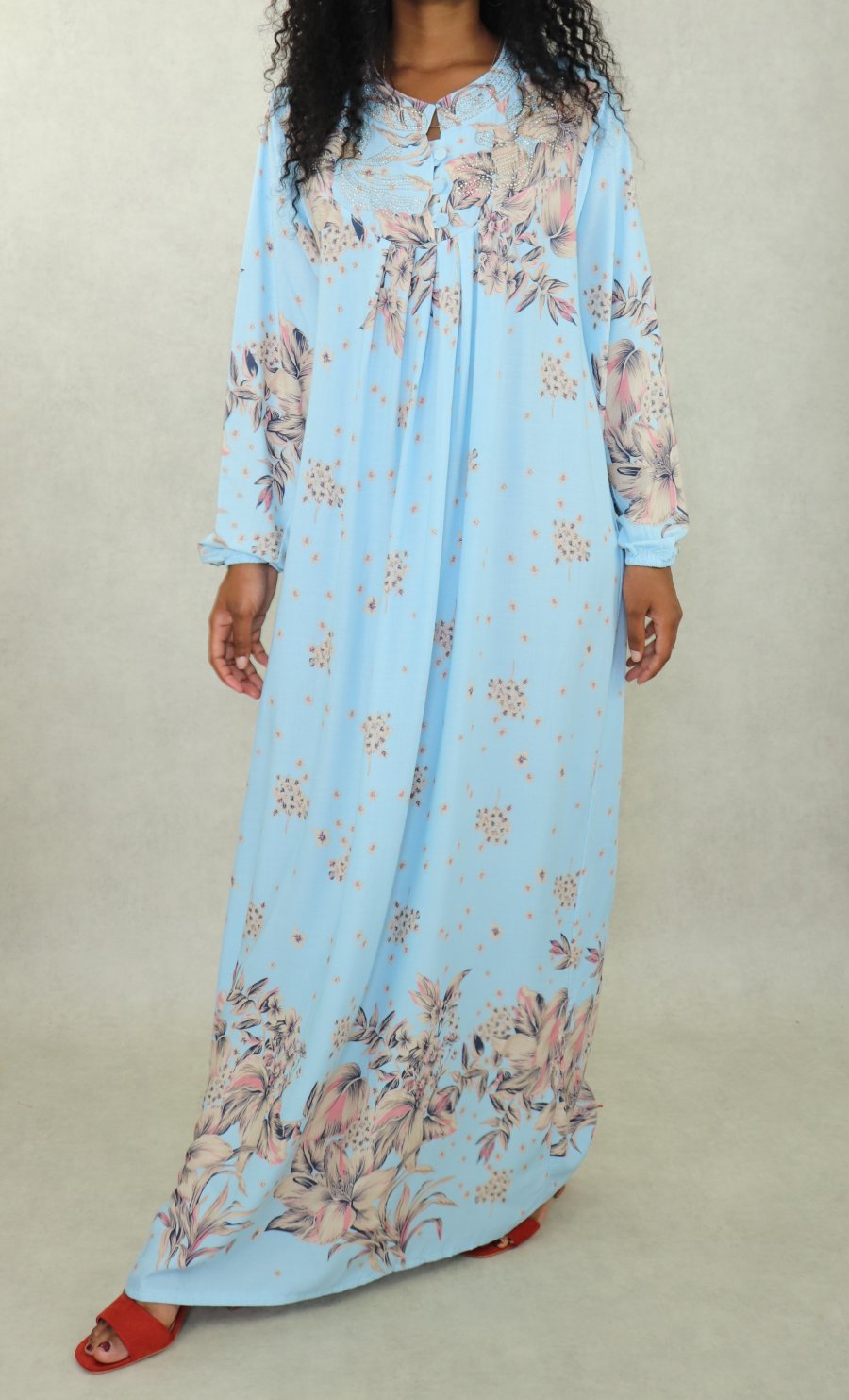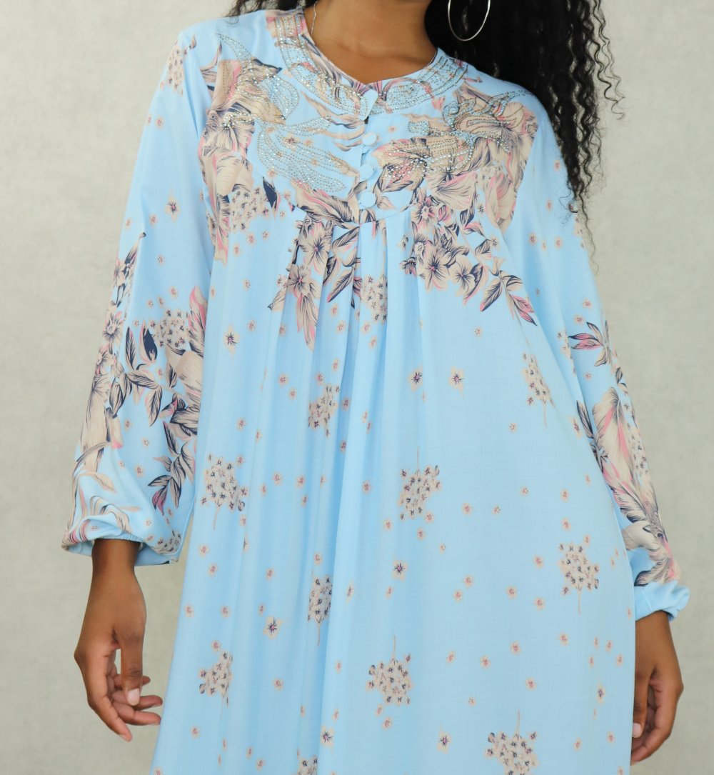 Robe d’intérieur avec motifs à fleurs sur fond Vert d'eau. Col rond avec quelle que strasse et trois boutons décoratifs sur l'avant, manches longues finition élastiques aux poignets, elle est douce et agréable.